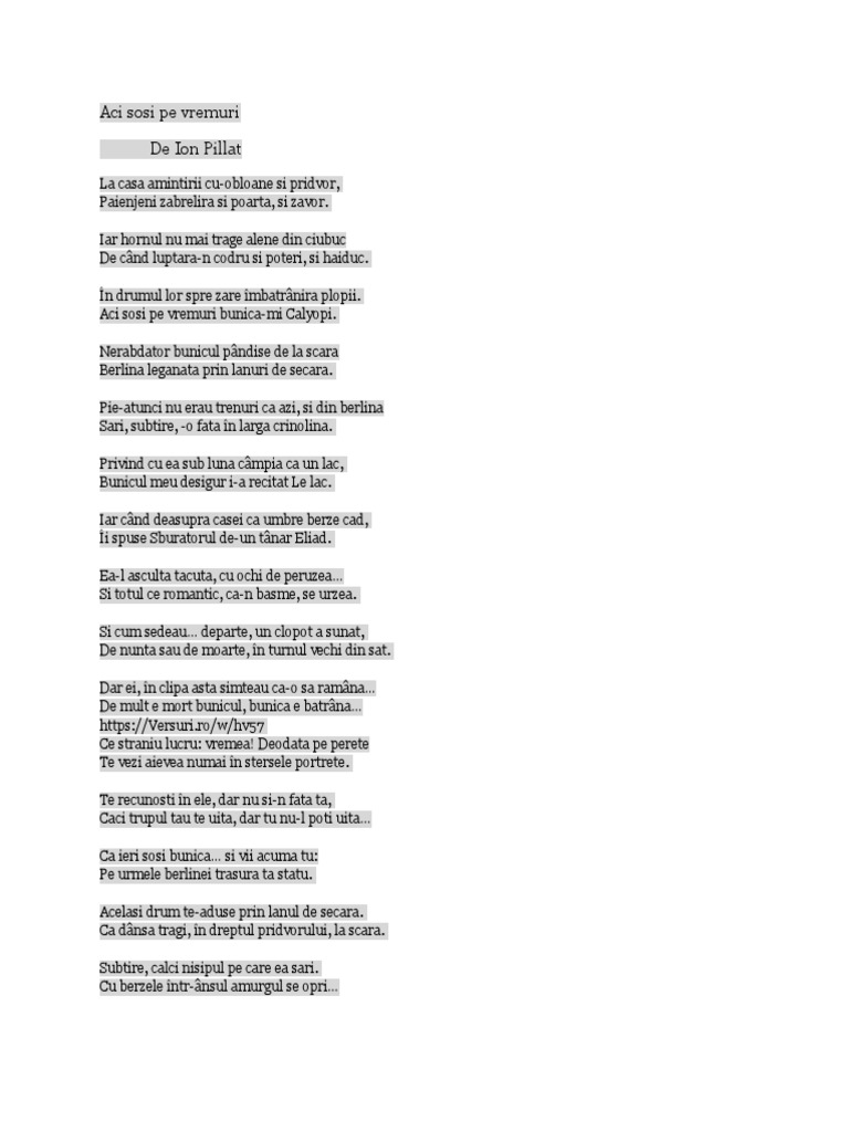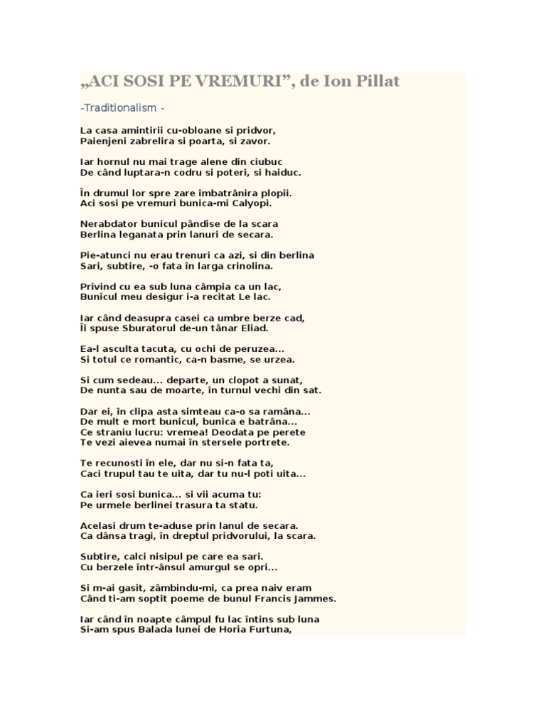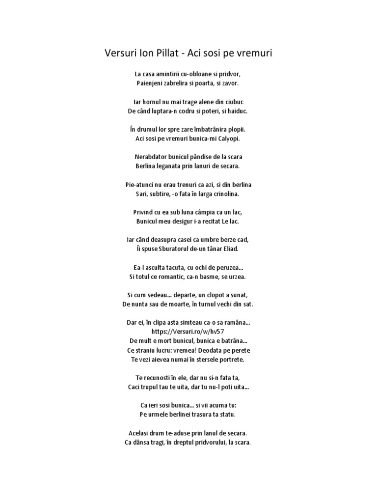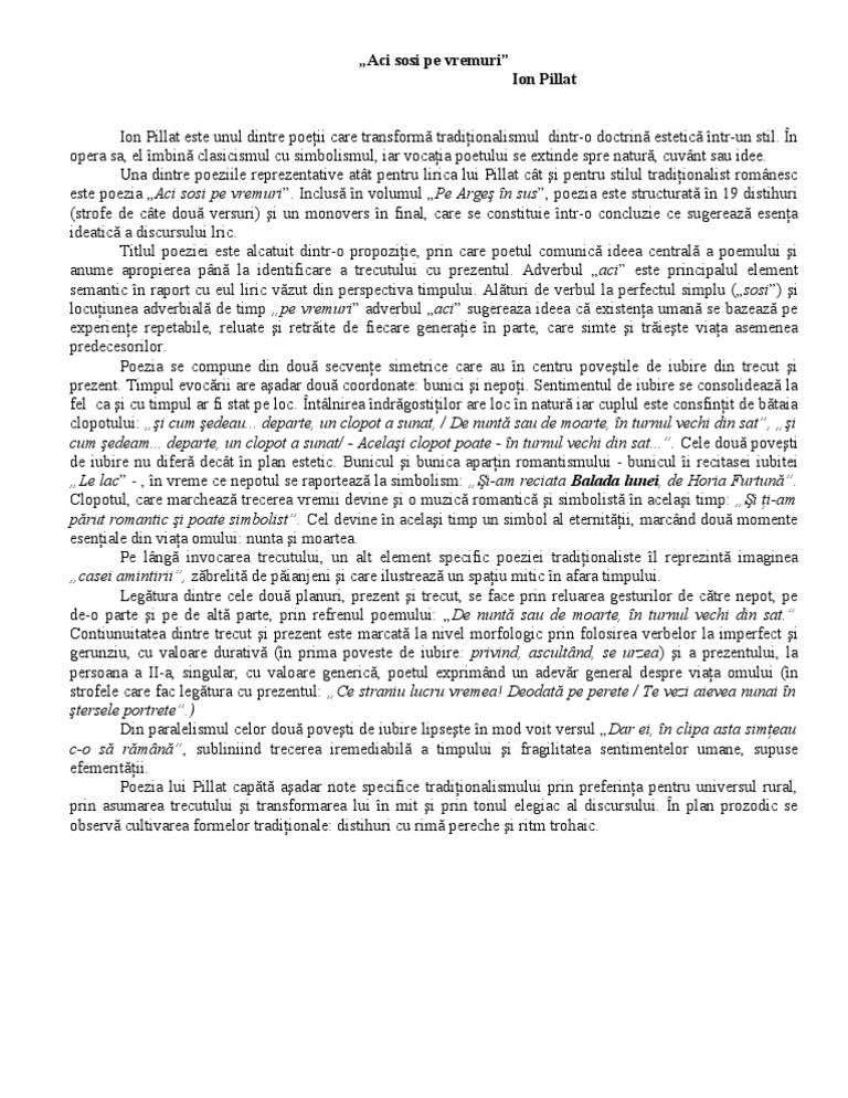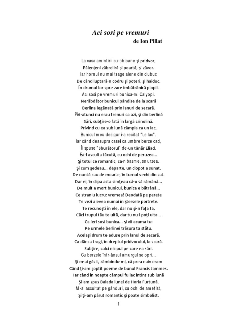 Aci sosi pe vremuri ion pillat. Privind cu ea sub lună câmpia ca un lac bunicul meu desigur i a recitat le lac. Alte lectii din romana. Aci sosi pe vremuri de ion pillat. Mai pregnant decât în cazul altor poeţi poezia lui ion pillat este deopotrivă exod şi înrădăcinare echilibru tensionat între poli contradictorii.