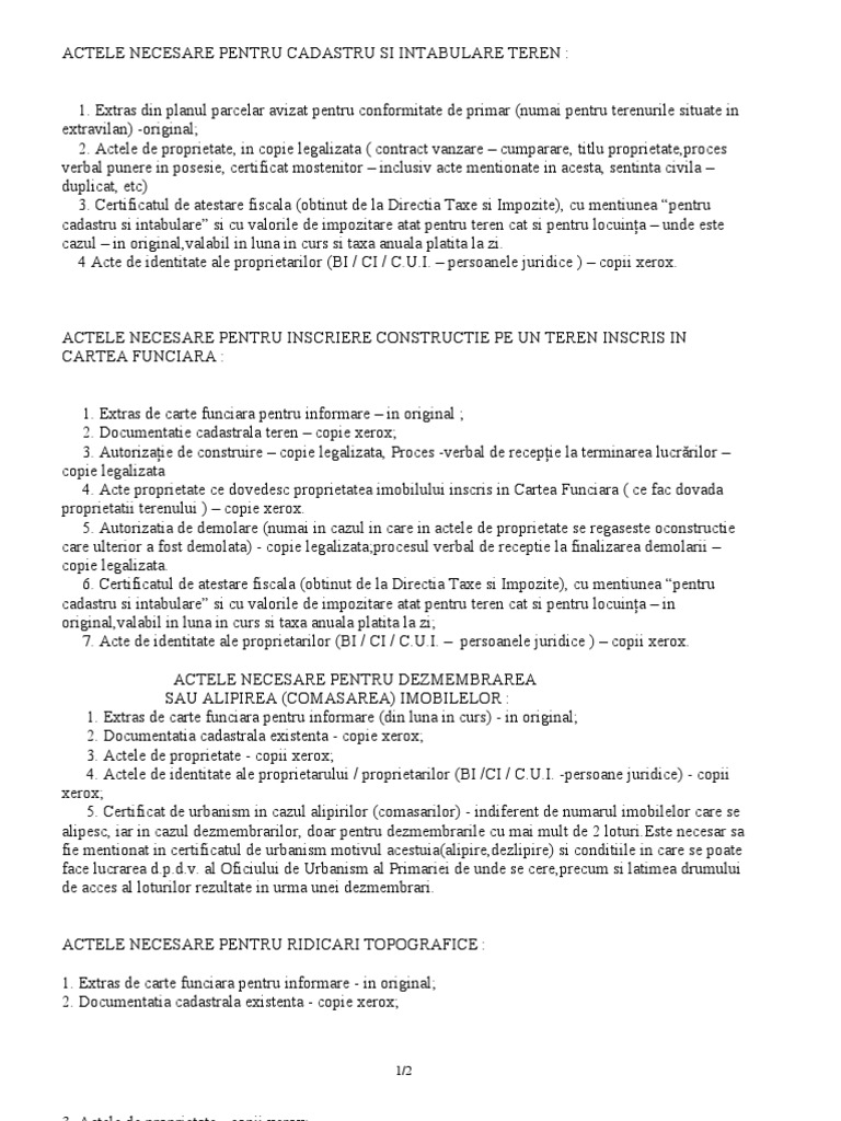 Găsiți mai jos lista actelor necesare pentru prima înscriere în cartea funciară. Contract vânzare cumpărare contract de donaţie proces verbal de predare primire sentinţă decizie civilă definitivă şi irevocabilă titlu de proprietate certificat. Parintii mei au construit o casa in 1962 fara autorizatie au deschis de atunci pana acum rol fiscal terenul pe care. Actele necesare intabulare constructii civile si industriale cadon servicii proiectare si cadastru iasi.