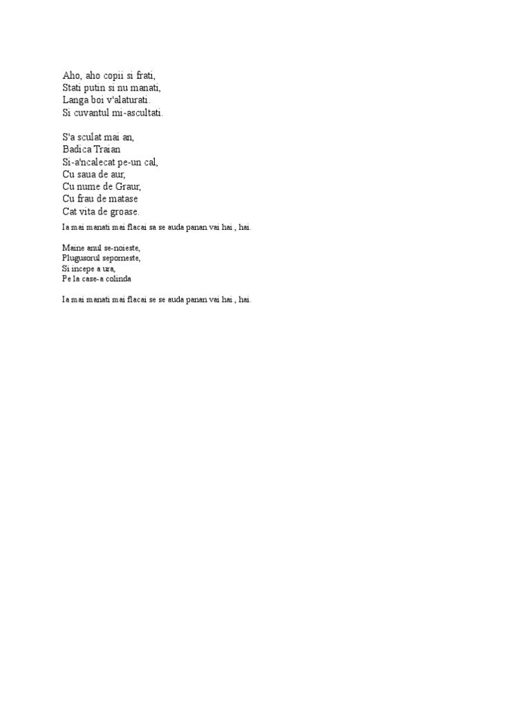 Aho aho copii si frati stati putin si nu manati langa boi v alaturati si cuvantul mi ascutati. S a sculat mai an bădica traian şi a ncălecat pe un cal învăţat s a sculat mai an bădica traian.