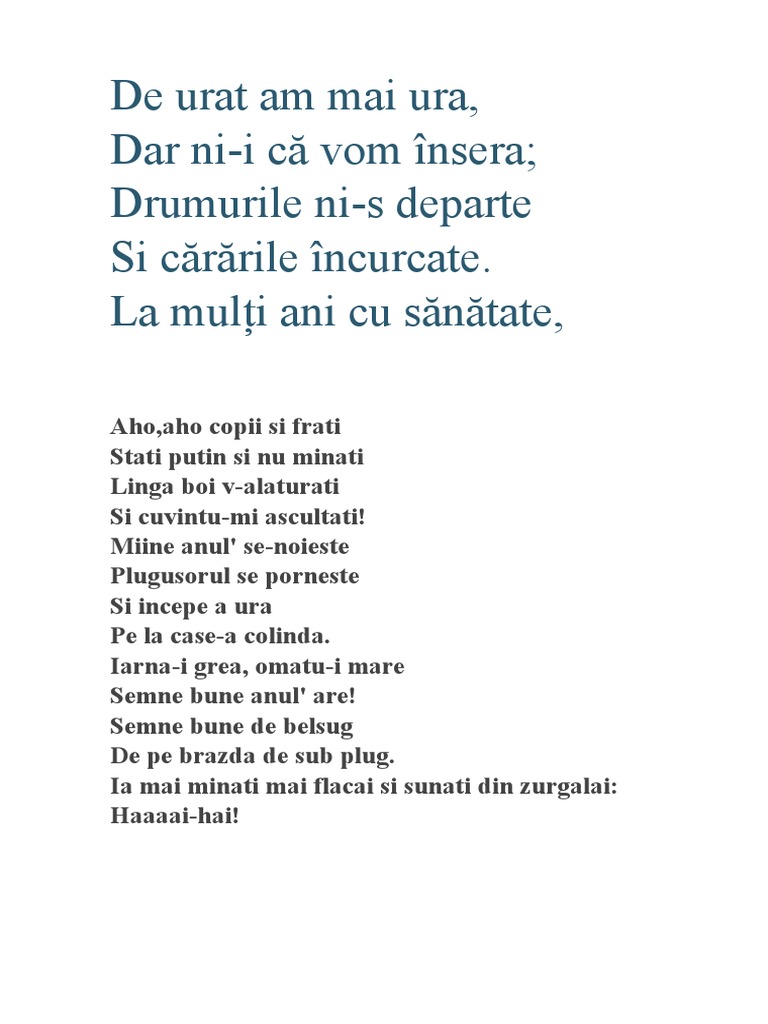 Aho aho copii și frați stați puțin și nu mânați și cuvântul mi ascultați de fapt nu al meu ci al lor. Aho aho copii și frați stați putin și nu mânați lângă boi v alăturați și cuvântul mi ascutați. Aho aho copii și frați. Aho aho copii si frati stati putin si nu manati langa boi v alaturati si cuvantul mi ascultati.