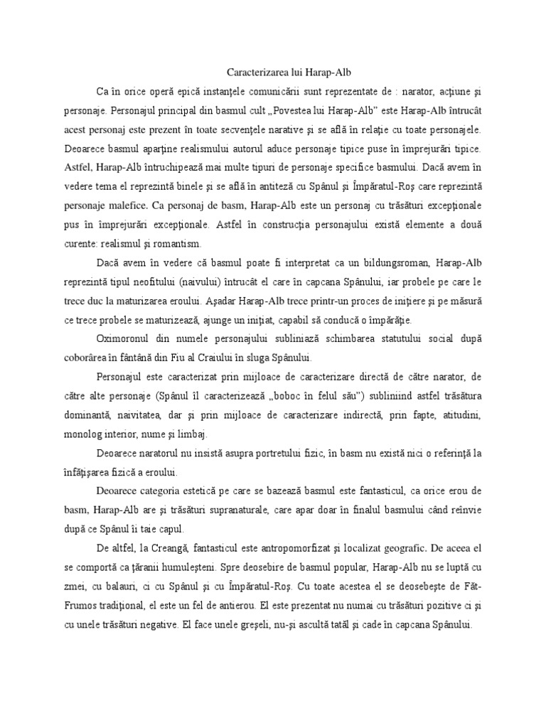 You are on page 1 of 2. 14 14 found this document not useful mark this document as not useful. Caracterizarea lui harap alb tatãl craiul îl pune pe acelaşi nivel cu fraţii sãi fapt ce l întristeazã pe mezin. Povestirile scrise de creanga sunt publicate in revista convorbiri literare intre anii 1875 1878 iar.