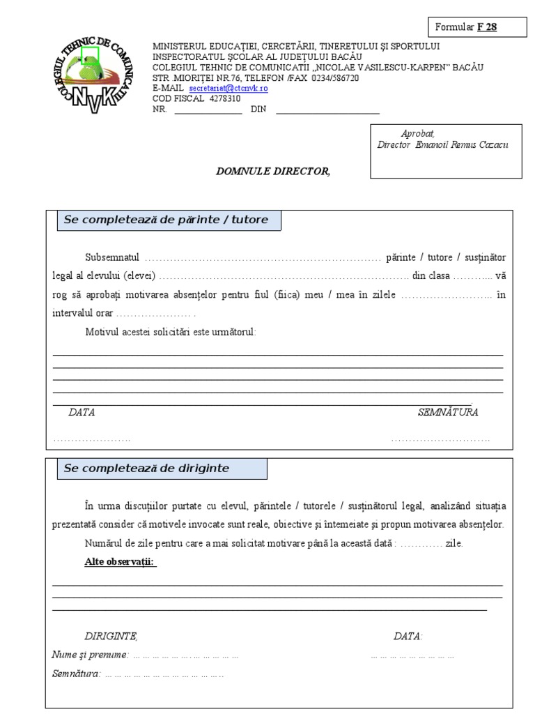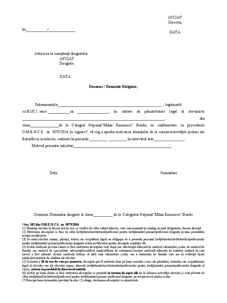 Forum despre model cerere de motivare a absentelor. Eşti pe cale să postezi un mesaj care poate încuraja pirateria şi distribuţia ilegală de materiale pe internet. 113 din regulamentul de organizare si functionare a unitatilor de invatamant preuniversitar aprobat prin omen nr. Director doamna invatatoare doamna domnule.
