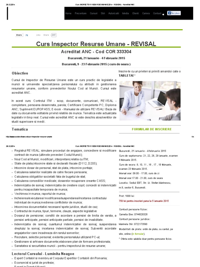 Ocupația de inspector referent resurse umane este necesară persoanelor care doresc să se califice în întocmirea şi gestionarea documentelor ce țin de evidența muncii într o organizație. Cursul de inspector referent resurse umane cod cor 333304 acoperă noțiuni legate de activitățile de evidență și salarizarea personalului din cadrul organizației în conformitate cu legislația actuală iar partea practică a cursului se va axa cu preponderență pe studii de caz exemple practice și operare în revisal. De asemenea imi puteti spune daca codul caen 7450 selectia si plasarea fortei de. Completează mai jos detaliile tale sau dă clic pe un icon pentru a te autentifica.