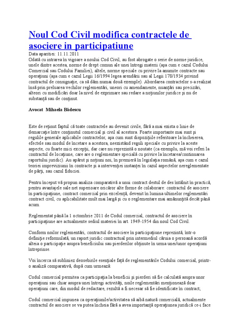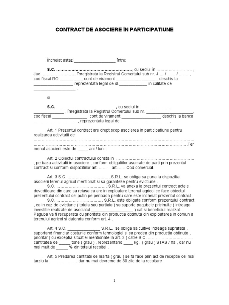 S c cu sediul în înregistrată în registrul comerţului sub nr având cont. Contractul de asociere în participaţie definiție şi reglementare contractul de asociere în participaţiune a fost dintotdeauna un contract comercial deoarece se încheia cu scopul vădit de a împărţi beneficiile şi pierderile unei afaceri comerciale. Contract de asociere în participaţie. Contract de asociatiune in participatiune doc.