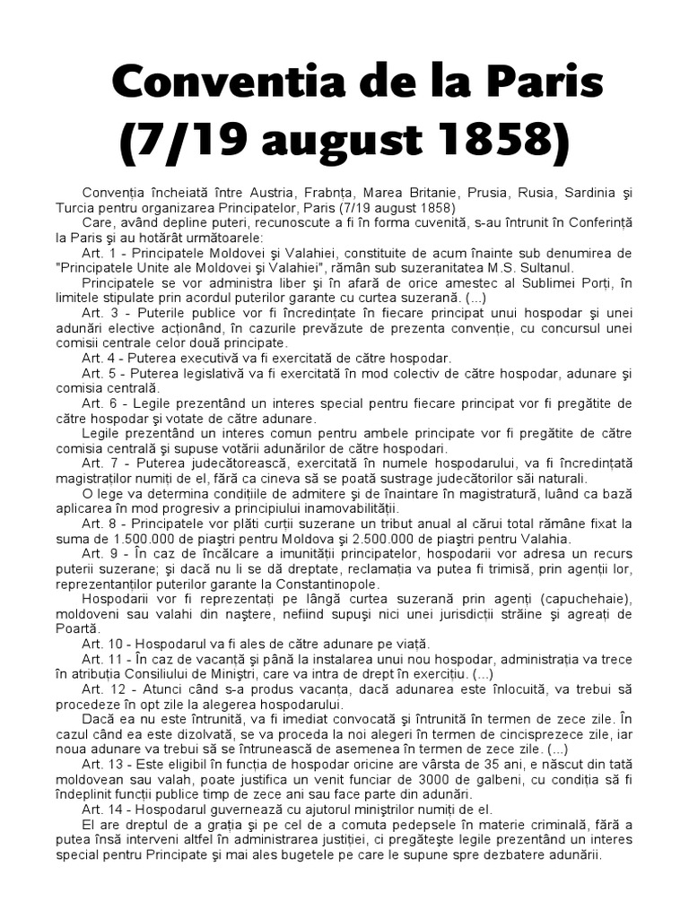Actul este considerat de unii autori prima constituție a româniei. Conventia de la paris 1858 august 7 paris. Convențiunea pentru organizarea definitivă a principatelor dunărene ale moldaviei și valahiei din 7 sv 19 sn august 1858 cunoscută mai mult sub numele de convenția de la paris a fost actul care a pus bazele unirii principatelor dunărene în conformitate cu hotărârile congresului de la paris din 1856. Convenţia de la paris august 1858.