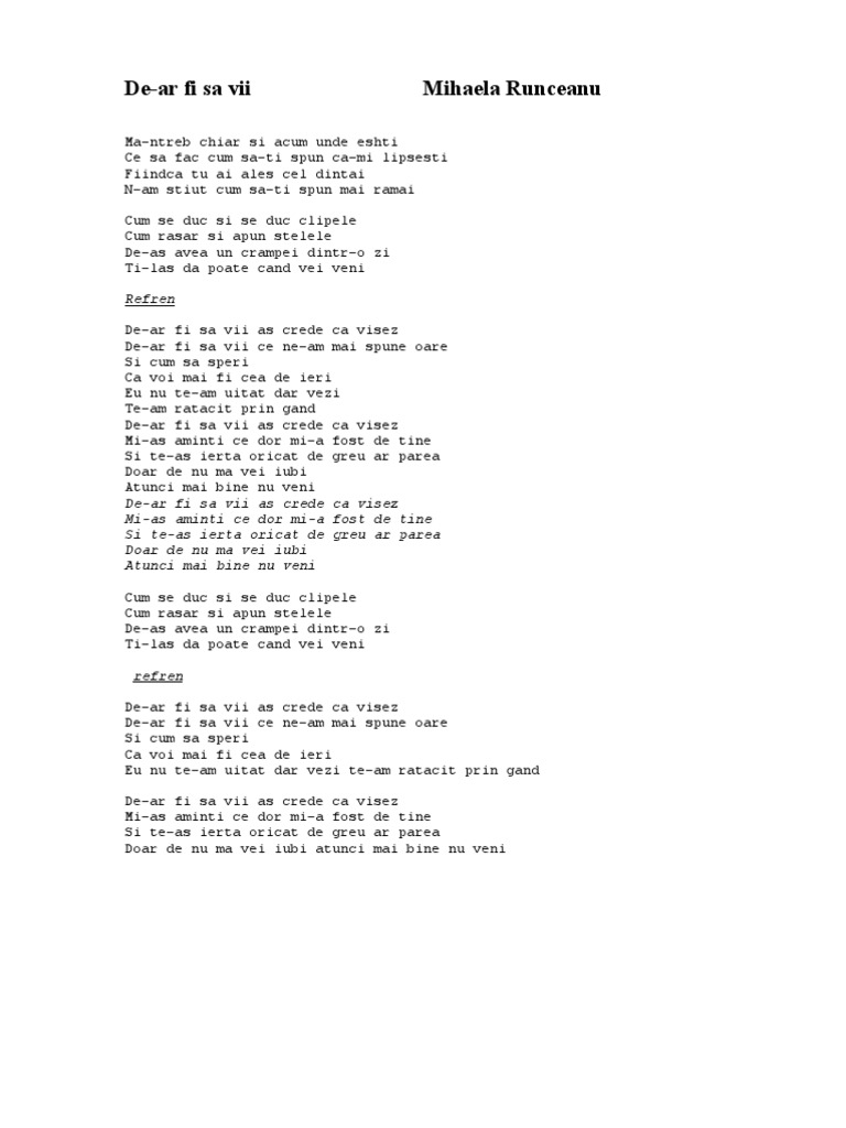 De ar fi sa vii as crede ca visez mi as aminti ce dor mi a fost de tine. Si te as ierta oricat de greu ar parea doar de nu ma vei iubi atunci mai bine nu veni. Mihaela runceanu mihaela valentina runceanu de ar fi să vii versuri. De ar fi sa vii as crede ca visez de ar fi sa vii ce.