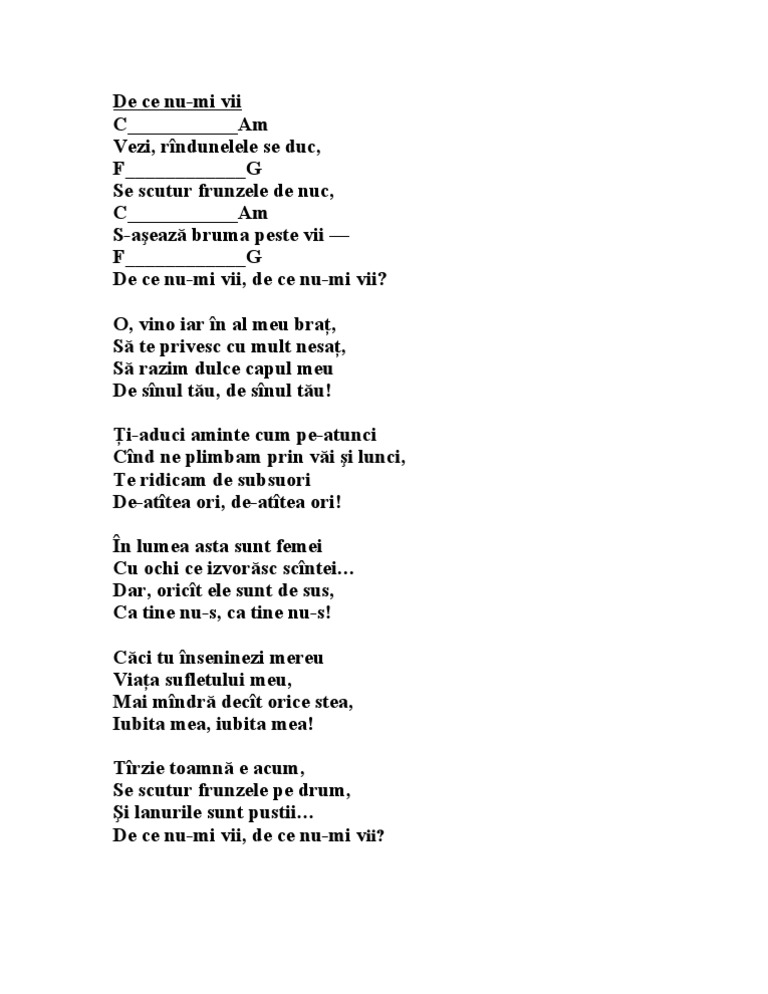 Vezi rindunelele se duc se scutur frunzele de nuc s aseaza bruma peste vii de ce nu mi vii de ce nu mi vii. O vino iar in al meu brat sa te privesc cu mult nesat sa razam dulce capul meu de sanul tau de sanul tau. ţi aduci aminte cum pe atunci când ne primblam prin văi şi lunci te ridicam de subsuori. Mihai eminescu de ce nu mi vii.