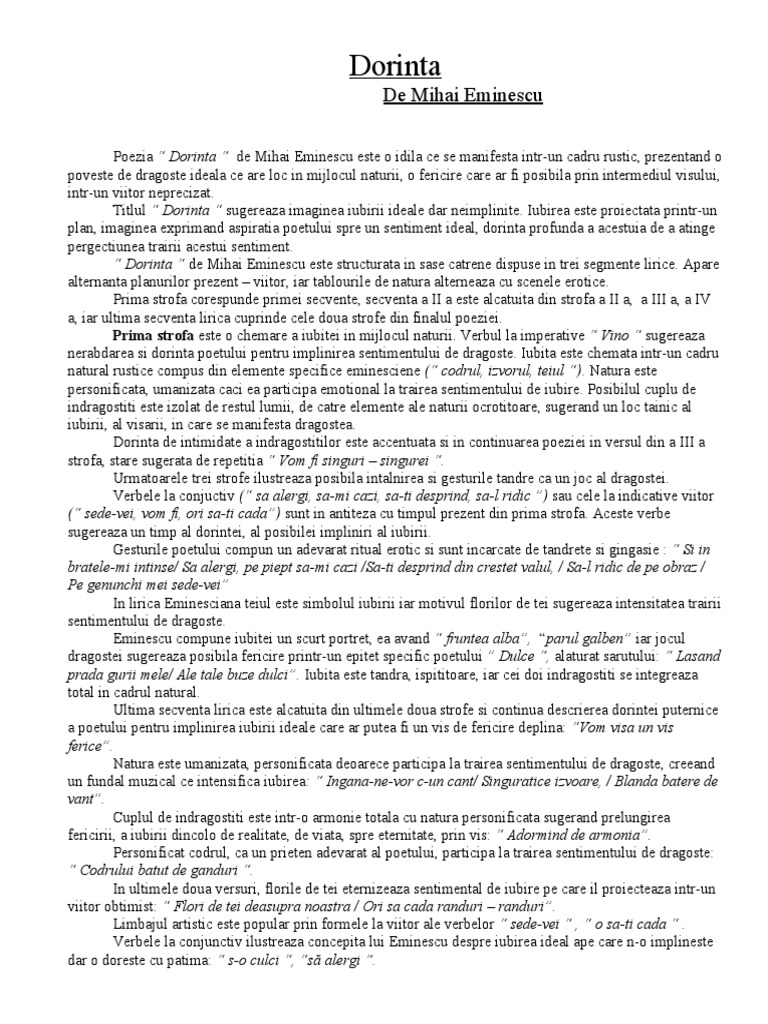 Construită in jurul temei iubirii și a naturii in cae motivele tipic romantice codrul izvorul floarea de tei circulă in modul cel mai firesc poezia este o vibrantă expresie a. Dorinţa de mihai eminescu comentariu 0. Publicată la 1 septembrie 1876 in revista convorbiri literare poezia dorința este o creație definitorie pentru intreaga viziune a marelui poet asupra naturii și iubirii. Postări atom lista mea de bloguri.