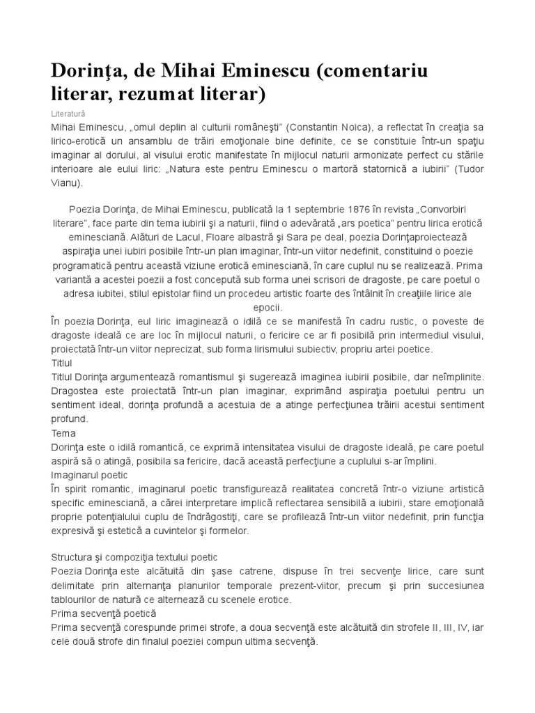 Dorinţa de mihai eminescu se dovedeşte a fi o expresie deplină a romantismului ce l a caracterizat plenar pe poetul nepereche al literaturii române. Mihai eminescu al cărui lirism se caracterizează în acest sens prin simţ cosmic. Printre poeziile lirice in care dragostea apare ca un vis de feridire petrecut in cadrul unui peisaj feeric de basm este si poezia dorinta pubilcata in comvorbiri literare in 1876. Comentariu dorinta de mihai eminescu comentarii comentariu dorinta de mihai eminescu.