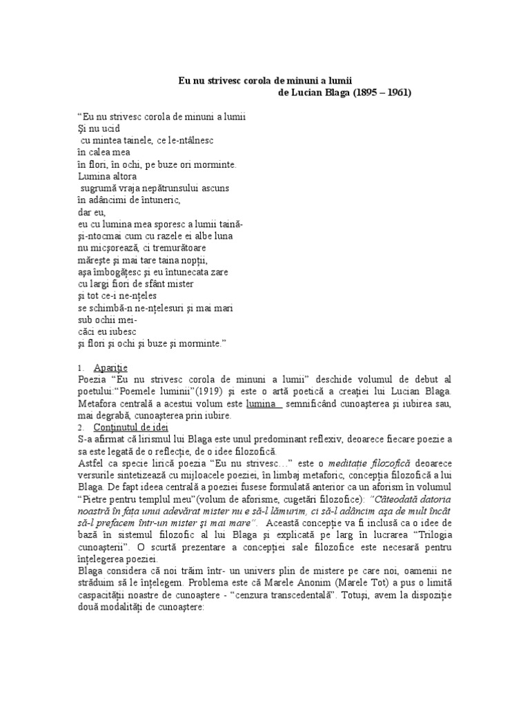 Eu nu strivesc corola de minuni a lumii comentariu literar. Eu nu strivesc corola de minuni a lumii si nu ucid cu mintea mea tainele ce le ntalnesc in calea mea in flori in ochi pe buze ori morminte. Eu nu strivesc corola de minuni a lumii de lucian blaga este o artă poetică modernă pentru că interesul autorului este deplasat de la principiile teh nicii poetice restrânse la enumerarea metaforelor care sugerează temele creaţiei sale şi la exemplificarea unor elemente de expresivitate specifice. Un mare constructor al modernismului romanesc din secolul al xx lea este eugen lovinescu pentru acest critic exista pe de o parte modernismul hard. Paralel poetul procedeaza la o singularizare a eului sau poetic.