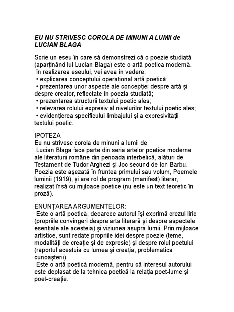 Eu nu strivesc corola de minuni a lumii și nu ucid cu mintea tainele ce le ntâlnesc în calea mea în flori în ochi pe buze ori morminte. Personalitate impunatoare si polivalenta a culturii romane interbelice lucian blaga a marcat perioada respectiva prin elemente de originalitate compatibile cu inscrierea sa la universitate. Lucian blaga a fost filosof poet dramaturg si traducator roman. Poezie modernista arta poetică eu nu strivesc corola de minuni a lumii de lucian blaga.