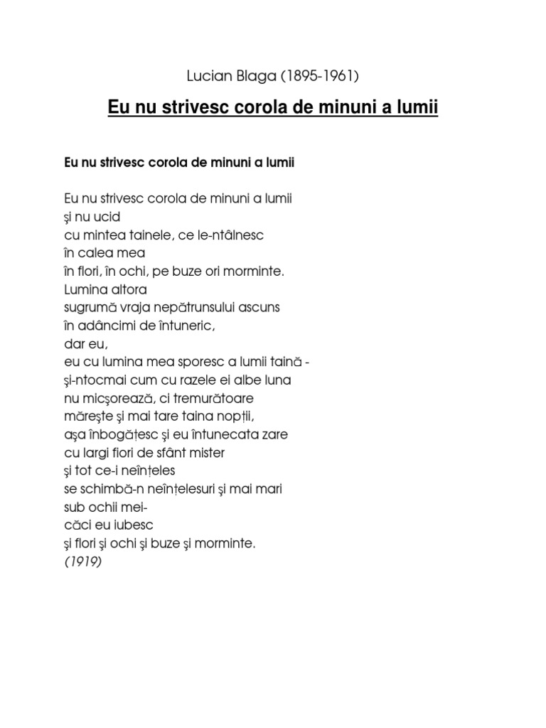 Eu nu strivesc corola de minuni a lumii poezie. Eu nu strivesc corola de minuni a lumii. Dacă arghezi punea în centrul artei sale poetice problema limbajului şi a cuvintelor potrivite blaga accentuează raportul dintre poet şi. Modernism eu nu strivesc corola de minuni a lumiişi nu ucidcu mintea tainele ce le ntâlnescîn calea meaîn flori în ochi pe buze ori morminte lumina altorasugrumă vraja nepătrunsului ascunsîn adâncimi de întuneric dar eu eu cu lumina mea sporesc a lumii taină şi ntocmai cum cu razele ei albe lunanu micşorează ci tremurătoaremăreşte şi mai tare taina nopţii aşa. Poezia este aşezată în fruntea.