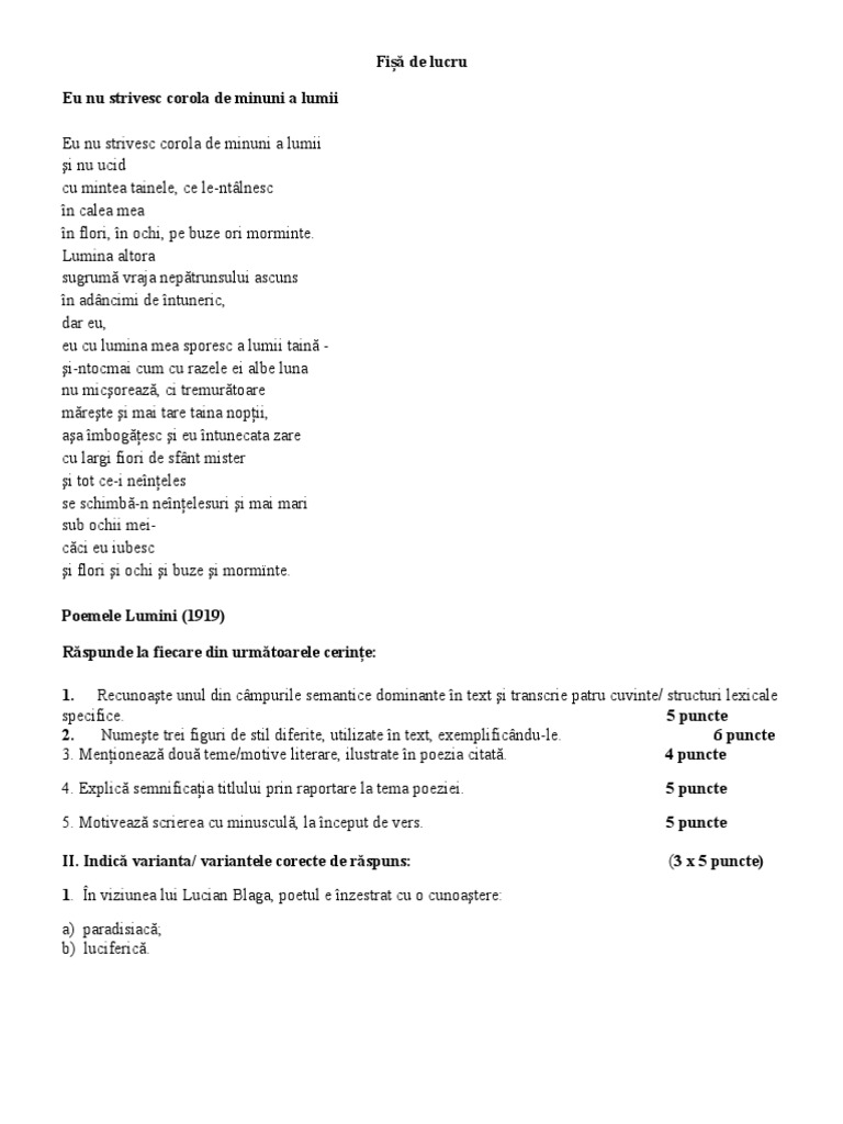 Eu nu strivesc corola de minuni a lumii. Eu nu strivesc corola de minuni a lumii şi nu ucid cu mintea tainele ce le ntâlnesc în calea mea în flori în ochi pe buze ori morminte. Lumina altora sugrumă vraja nepătrunsului ascuns în adâncimi de întuneric dar eu eu cu lumina mea sporesc a lumii taină şi ntocmai cum cu razele ei. Eu nu strivesc corola de minuni a lumii. Dacă arghezi punea în centrul artei sale poetice problema limbajului şi a cuvintelor potrivite blaga accentuează raportul dintre poet şi.
