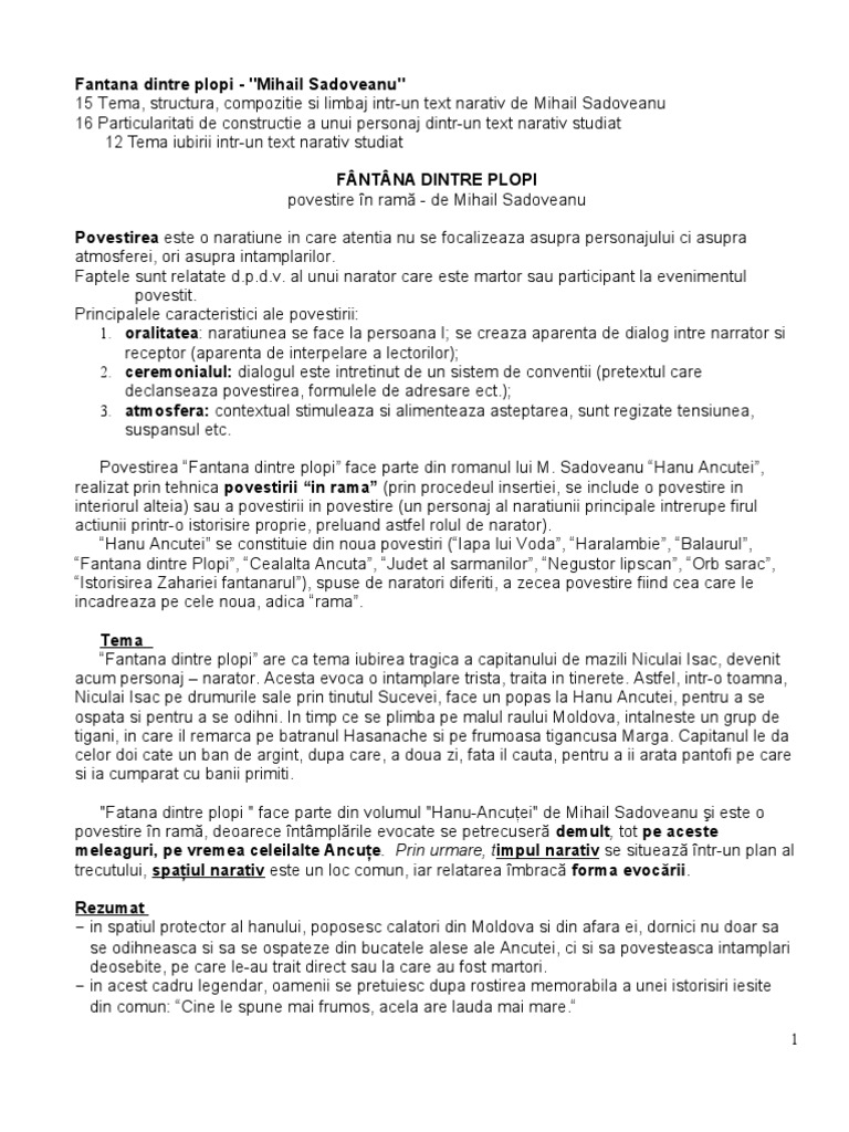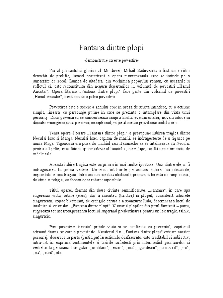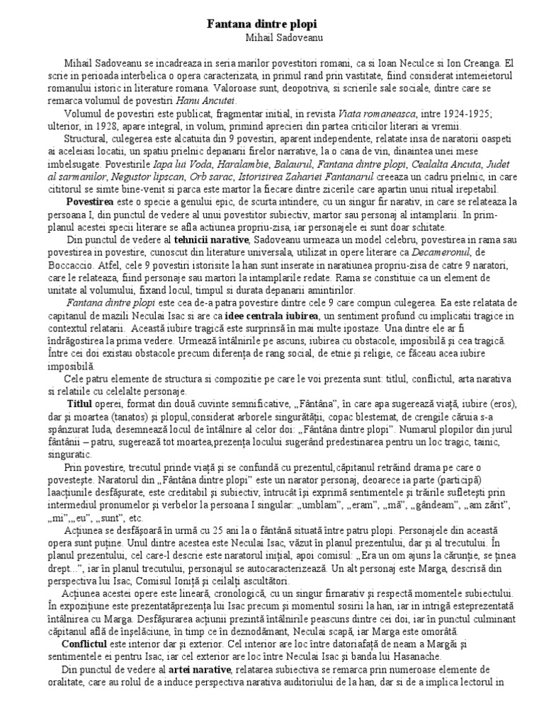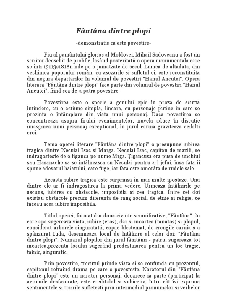 1 introducere opera literara fantana dintre plopi a aparut in 1928 in volumul hanul ancutei care a fost considerata capodopera de rascruce deoarece face trecerea spre marea etapa a creatiilor sadoveniene si deoarece e o sinteza de elemente diverse. Fantana dintre plopi de mihail sadoveanu rezumat back naratorul relatează sosirea unui drumeţ la locul de popas numit hanul ancuţei. Intr o toamna ca aceasta dupa ce a dus vin la suceava a facut un popas la hanul ancutei dar a incalecat si s a plimbat aproape de malul moldovei pana ce a auzit vocile a unor tigani. Fântâna dintre plopi este o povestire în ramă a patra din volumul hanul ancuţei a lui mihail sadoveanu.