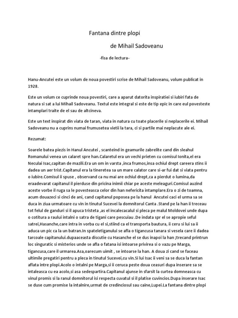 Hanul ancutei fantana dintre plopi rezumat. Fântâna dintre plopi al cărei rezumat l am redat mai jos este una din cele nouă povestiri ce apar în volumul hanul ancuței publicat de mihail sadoveanu în anul 1928. Lumea taraneasca idila legenda. Povestirea fantana dintre plopi de m sadoveanu. Fantana dintre plopi scurt rezumat free download as word doc doc docx pdf file pdf text file txt or read online for free.