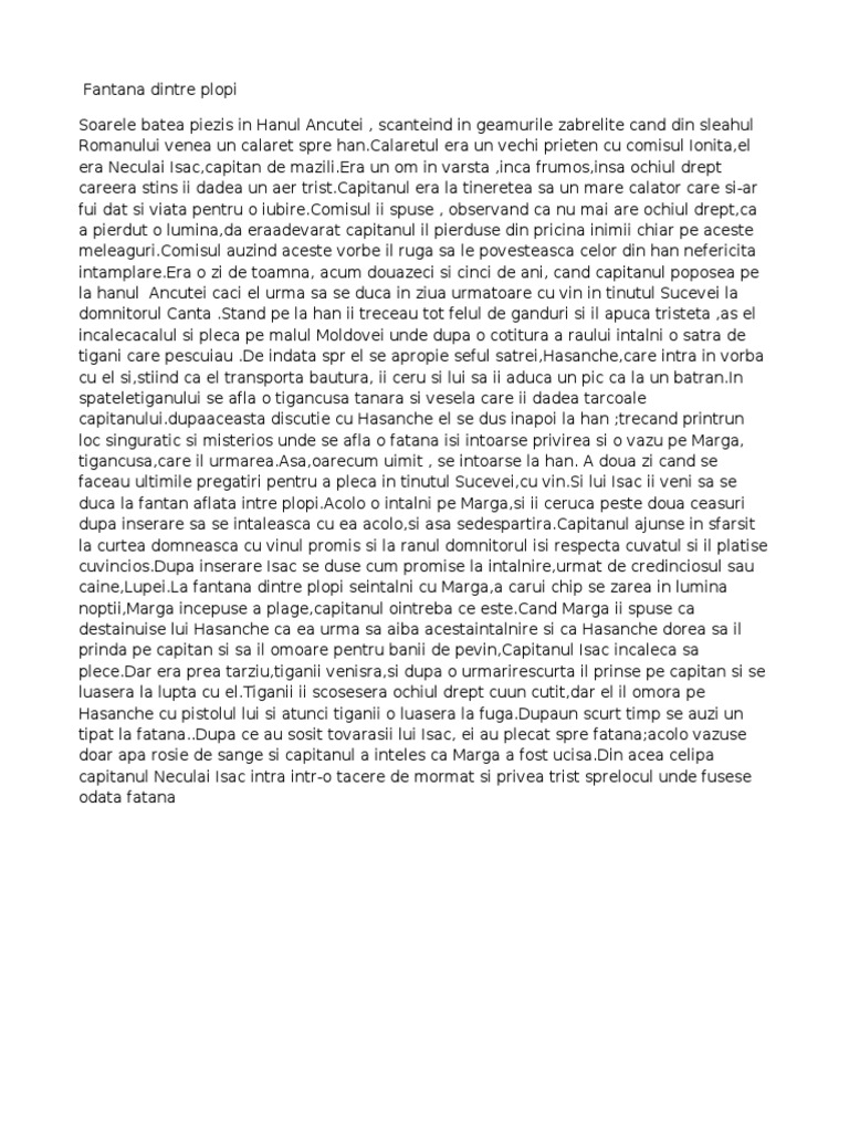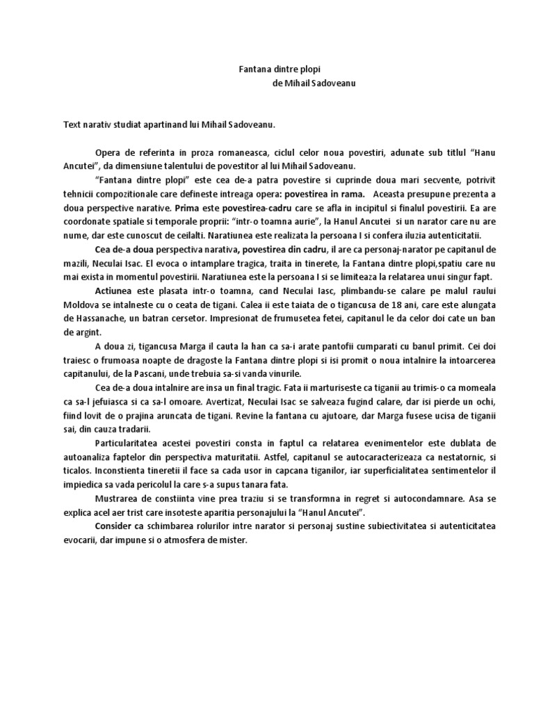 Doua rezumate scurte la povestirea hanul ancuței scrisa de scriitorul roman mihail sadoveanu si publicata in anul 1928. Fântâna dintre plopi 24 8k 113 3. într o seară de toamnă niculai isac un bătrân călător prin meleagurile sucevei se opreşte la hanul ancuţei pentru a şi trage sufletul. Fantana dintre plopi soarele batea piezis in hanul ancutei scanteind in geamurile zabrelite cand din sleahul romanului venea un calaret spre han calaretul era un vechi prieten cu comisul ionita el era neculai isac capitan de mazili era un om in varsta inca frumos insa ochiul drept care era stins ii dadea un aer trist capitanul era la tineretea sa un mare calator care si ar fui dat si viata.