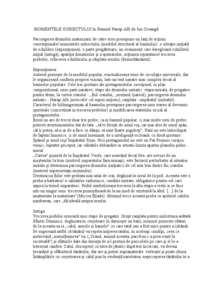Momentele subiectului momentele subiectului în basmul harap alb de ion creangă parcurgerea drumului maturizarii de catre erou presupune un lanţ de acţiuni convenţionale momentele subiectului modelul structural al basmului. Ion povestire pe momentele subiectului. Salvare salvați momentele subiectului harap alb pentru mai târziu. Desfasurarea actiunii incepe odata cu sosirea celor doi la curtea imparatuluiunde craiul foarte arrogant il trimite pe harap alb sa doarma cu caii si chiar il plezneste pentru a si arata calitatea de stapan.