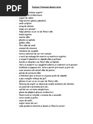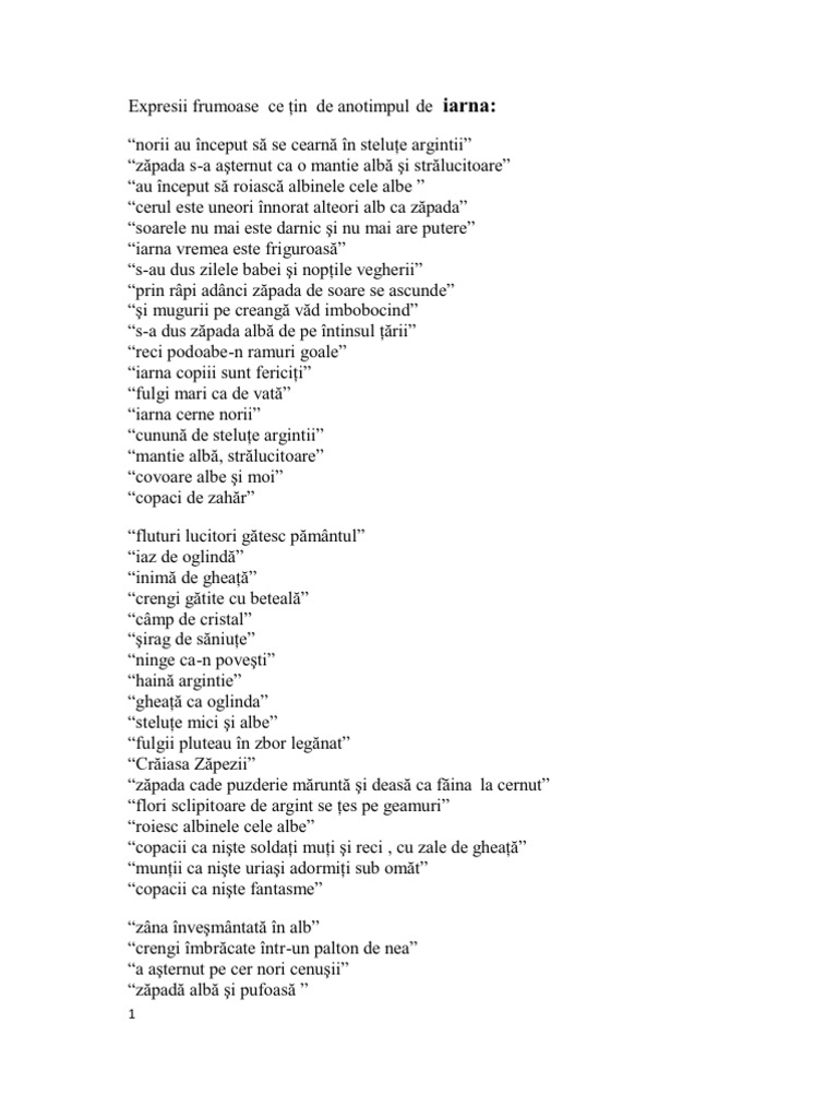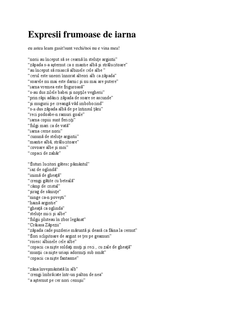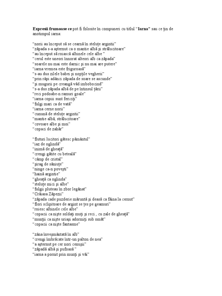 Compunere despre iarna cu expresii frumoase si figuri de stil. Iarna alba si vesela cu inima inghetata a venit cu stelute albe n frunte. De atunci câteva milioane de vizitatori au citit textele compuneri pentru școală. Norii au început să se cearnă în steluţe argintii zăpada s a aşternut ca o mantie albă şi strălucitoare au început să roiască albinele cele albe cerul este uneori înnorat alteori alb ca zăpada.