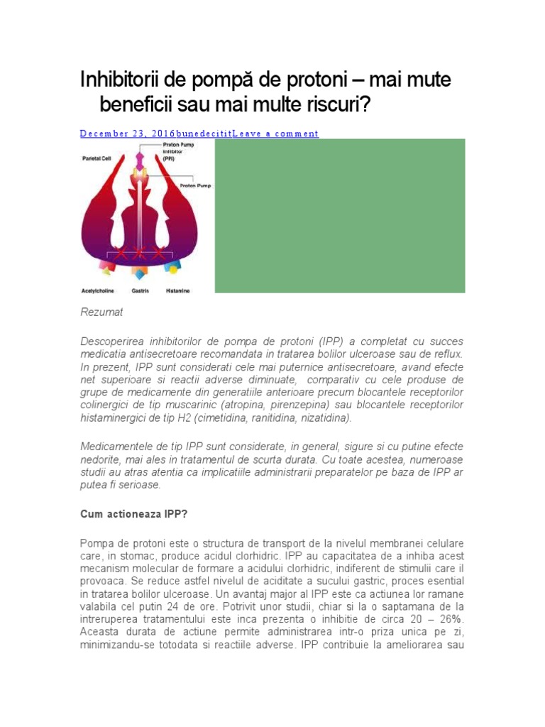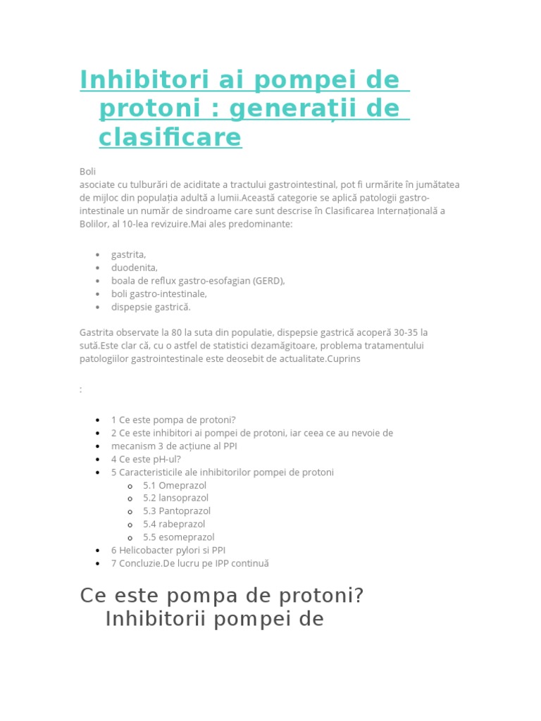 Boala de reflux gastroesofagian hernie hiatala inhibitor de pompa de protoni prof. Inhibitorii pompei de protoni sunt cei mai potenți agenți de reducere a secreției gastrice depășind ca și utilizare. Preparatele din pompa de protoni sunt administrate pe cale orală sub formă de tablete sau capsule substanță medicamentoasă din stomac intră în intestinul subțire sunt dizolvate și absorbite în fluxul sanguin care transporta prima moleculă de inhibitor în ficat iar apoi acestea se încadrează în celulele parietale ale mucoasei gastrice unde se pot acumula în tubulii secretoare. Proton pump inhibitor.