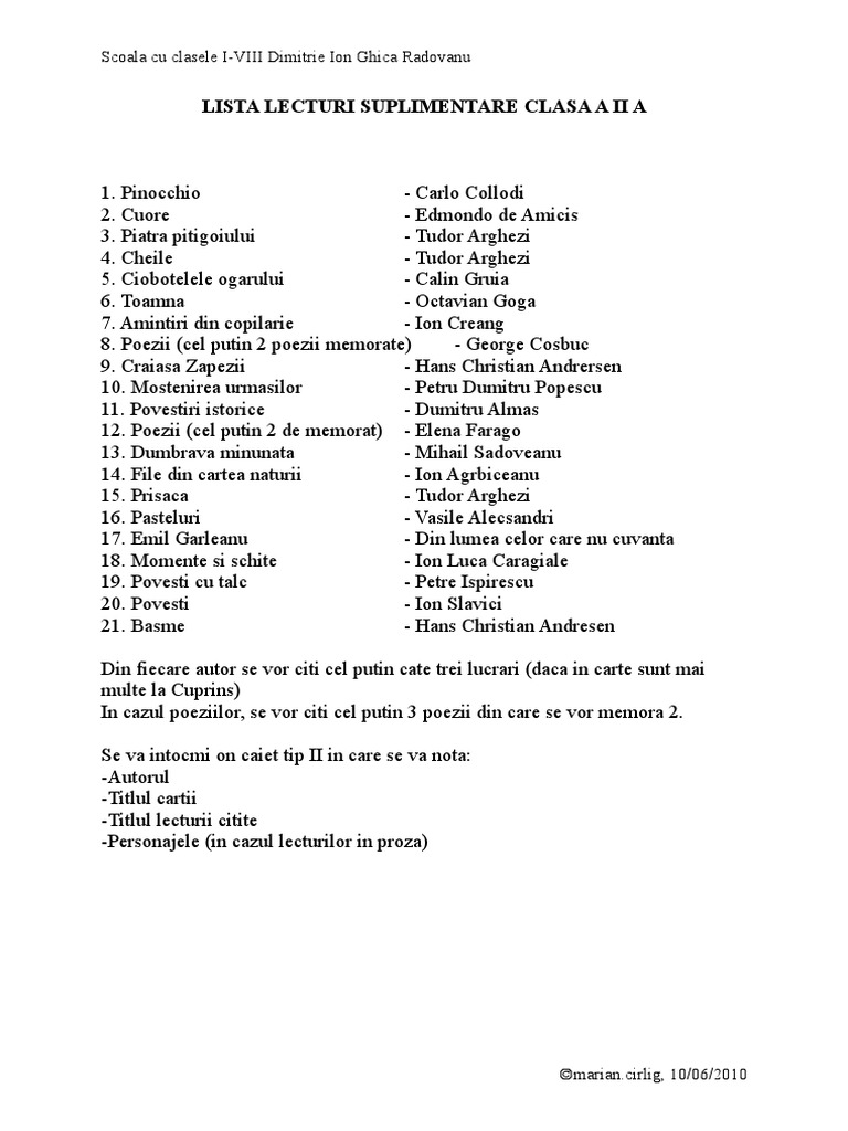 O lista de lecturi suplimentare pentru clasa a iii a si fisa de lectura ce trebuie completata pentru acestea. In plus doua trei carti citite pe timpul. Monastirea argesului balade culte. Lista de lecturi suplimentare pentru vacanta clasa a v a.