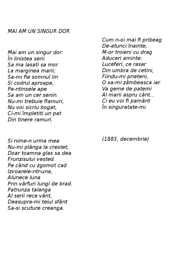 Mai am un singur dor comentariu. Astfel importanta titlului este deosebita caci el rezuma si anticipeaza continutul textului sintagma mai am un singur dor are in component un adverb un verb un adjectiv si un substantiv cu articol nehotarat un. Mai am un singur dor este o elegie romantica fiindca sentimentul de tristete structureaza tema ideea si eul poetic pentru ca avem o evaziune in natura in mit si chiar in nefiinta. Mai am un singur dor. Sa mi fie somnul lin si codrul aproape pe ntinsele ape sa.
