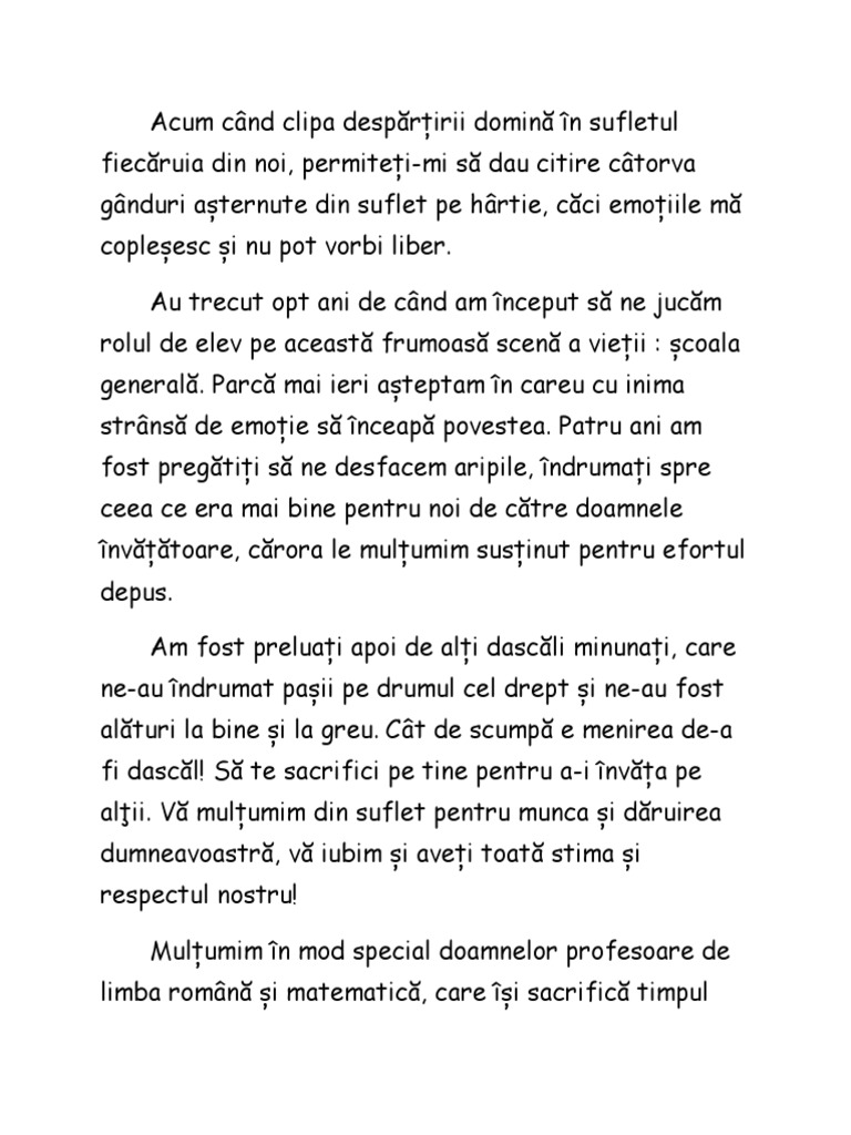 Ei bine intram pentru prima dată într o sală de clasă clasă care din păcate anul acesta nu ne a mai deservit dar în pereţii acelei clase cu siguranţă sunt gravate toate amintirile noastre din 7 ani de zile. Dragii mei colegi stimaţi profesori ne am întâlnit în acest cadru festiv pentru a mai simţi bucuria de a fi împreună şi de a ne împărtăşi sentimentele pentru a încerca să mai învăţăm ceva unii de la alţii înainte a porni. Poezia este compusa de mama mea in 15 minute. Dragi colegi va doresc un viitor frumos si maret.