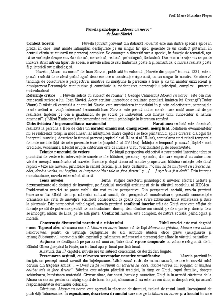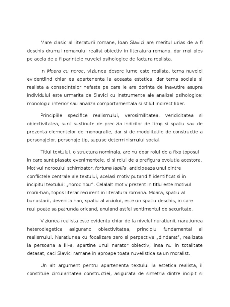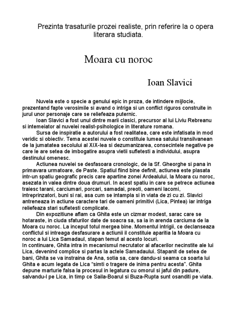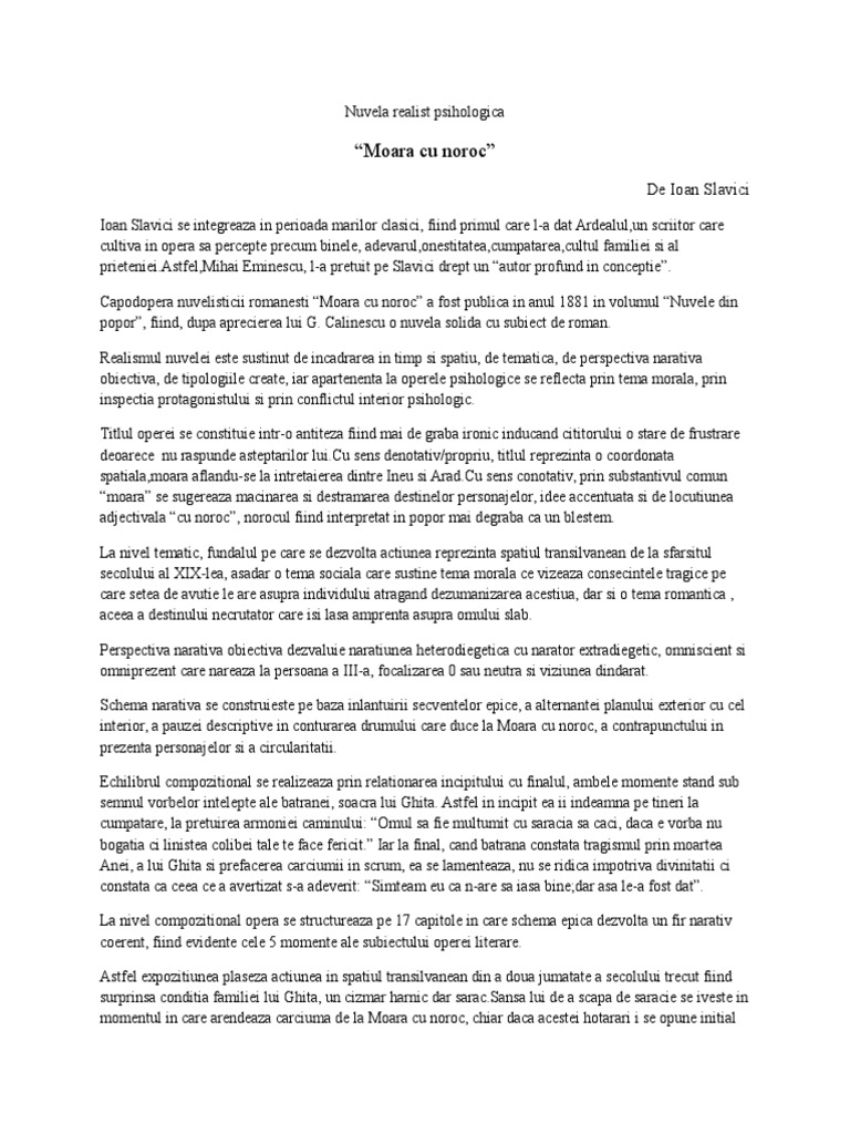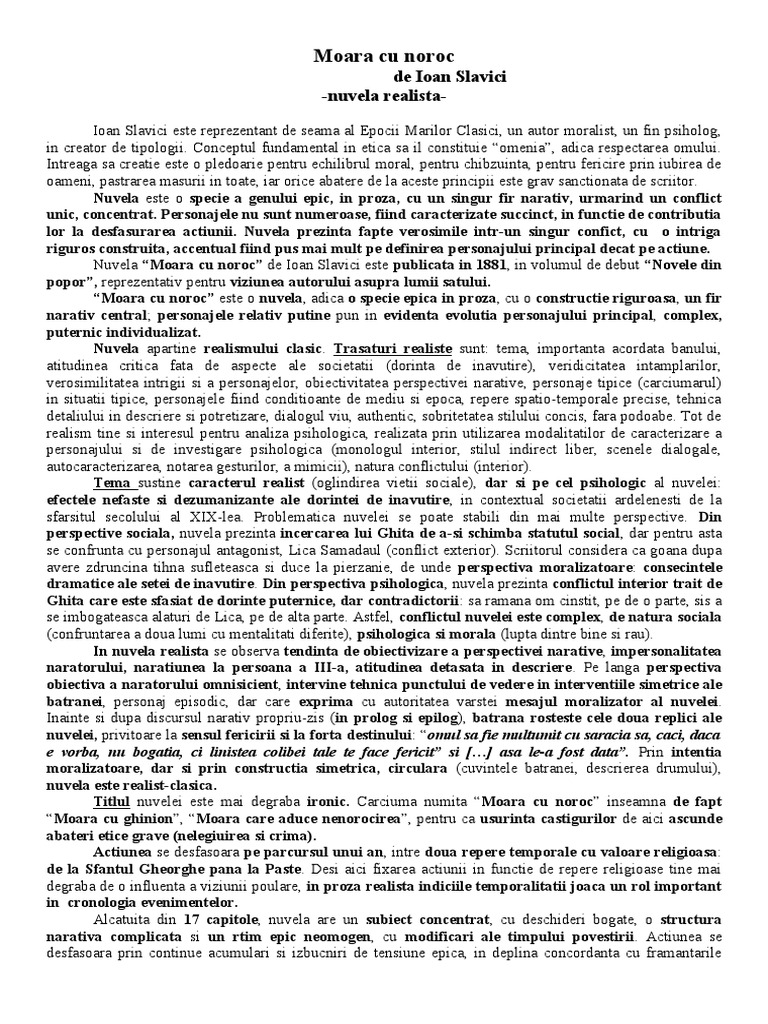Opera literara moara cu noroc de ioan slavici este o nuvela realista deoarce are ca trasaturi. Nuvela psihologica moara cu noroc ioan slavici autor ca scriitor ioan slavici apartine epocii marilor clasici 1870 1890 alaturi de mihai eminescu i l caragiale ion creanga si titu maiorescu. Aici în vale e moara cu noroc. Oglindirea vietii sociale si a vietii de familie in satul transilvanean de la sfarsitul secolului al xix lea efectele in plan moral ale patrunderii relatiilor capitaliste in mediul rural importanta acordata banului crearea de personaje tipice representative pentru lumea ardeleneasca din.