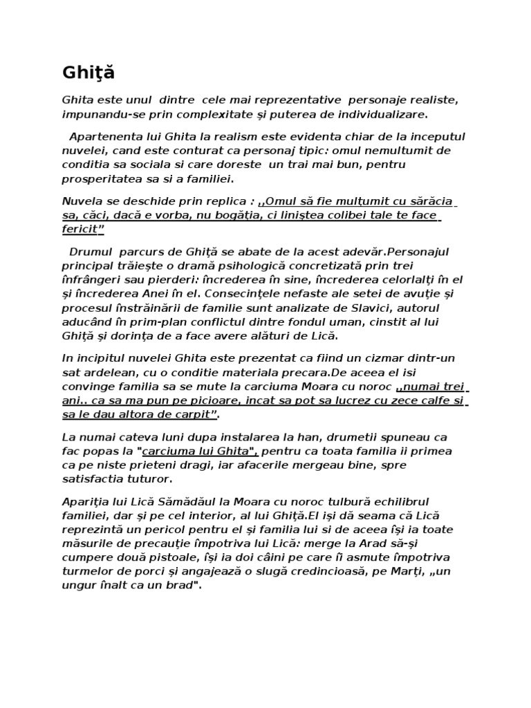 Moara cu noroc apartenenta la realism. Moara cu noroc de ioan slavici demonstratie ca e nuvela ioan slavici este un autor moralist un fin psiholog un creator de tipologii a carui opera este o pledoarie pentru echilibrul moral pentru chibzuinta si intelepciune pentru fericire prin iubirea de oameni si pastrarea masurii in toate orice abatere de la aceste principii fiind grav sanctionata de autor. Aparitia lui lica samadaul la moara cu noroc un personaj ciudat carismatic seful porcarilor si al turmelor de porci din imprejurimi tulbura echilibrul familiei. în expoziţiune ghiţă cizmar sărac dar onest şi muncitor doreşte să şi schimbe statutul social şi ia în arendă cârciuma de la moara cu noroc. In concluzie moara cu noroc este o nuvela realista de analiza psihologica prin care ioan slavici se dovedeste un fin observator al universului sufletesc construing personaje convingatoare maiestria prozatorului reiese din siguranta cu care manuieste dialogurile monologurile ce evidentiaza zbuciumul sufletesc al personaului central se remarca totodata si atutenticitatea limbajului.