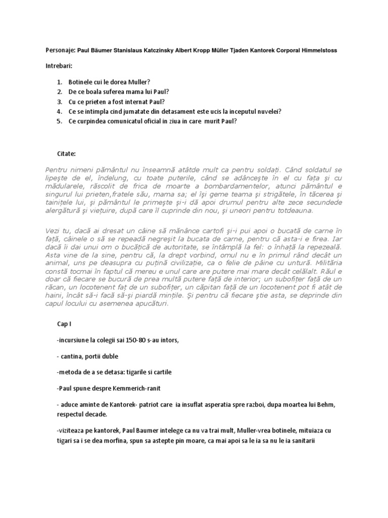 100 1 100 au considerat acest document util 1 vot 7k vizualizări 6 pagini. A fost gasit cu fata in jos rasturnat in tarana ca si cum ar fi dormit. Iosif bem eroul lucrării nimic nou pe frontul de vest rezumat descriem războiul de a merge nu a vrut dar temându se incapacitatea de a reduce tot drumul pentru noi m am alăturat în calitate dealții voluntar a ucis unul dintre primii el nu a putut din cauza rănilor sale în ochi pentru a găsi adăpost soldatul a pierdut un punct de reper și eventual a fost împușcat. Salvare salvați nimic nou pe frontul de vest rezumat pe capitole pentru mai târziu.