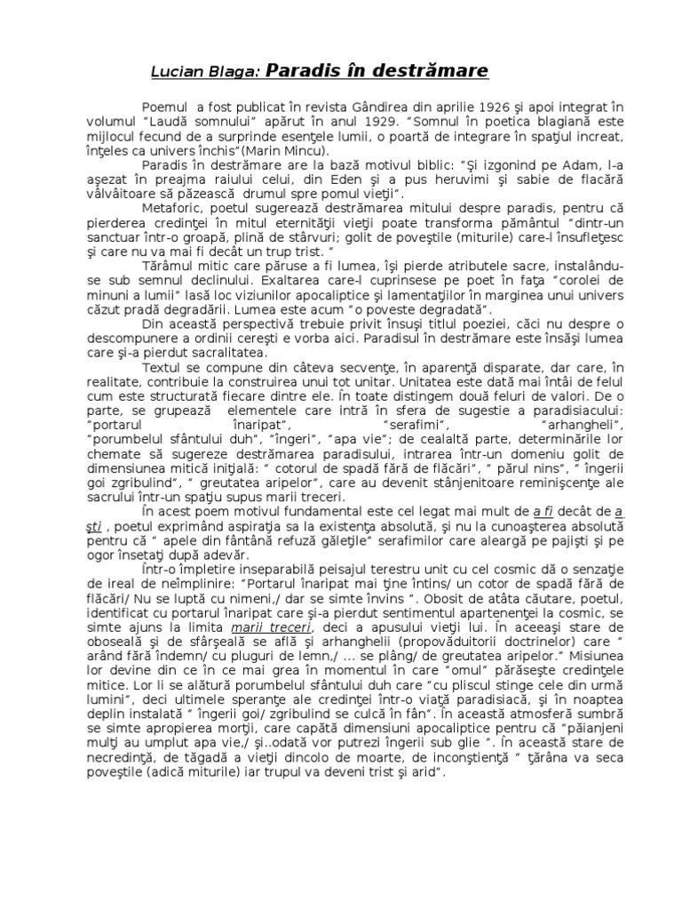 Pretudindeni pe pajişti şi pe ogor serafimi cu păr nins însetează după adevăr. 9 mai 1895 lancrăm lângă sebeș comitatul sibiu d. Paradis in destramare de lucian blaga autor canonic elegie filozofica moderna poezia paradis in destramare de lucian blaga 1895 1961 este inclusa in volumul lauda somnului aparut in 1929 si valorifica mitul biblic conform caruia dumnezeu a pus heru. Paradis in destramare de lucian blaga.