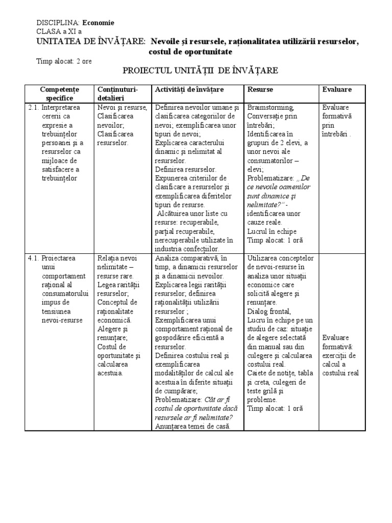 Planificare Pe Unitati De Invatare