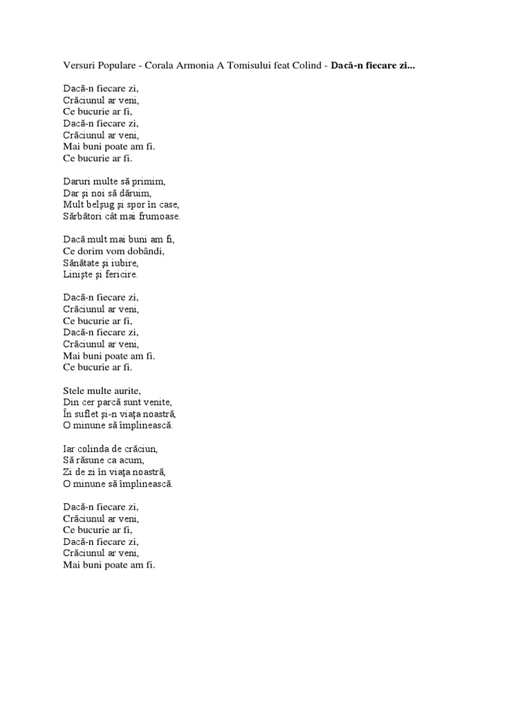 Primeneste ti gazdã casa umple vadra pune masa fã potecã prin grãdinã si n pridvor tine luminã cã venim de multisor drumul nu ne a fost usor tot prin viscol tot prin gloatã ziua toatã noaptea toatã gerul iernii ne a pãtruns dar de ajuns tot am ajuns sã ti cântãm sã ti colindãm vestea nasterii sã ti dãm.
