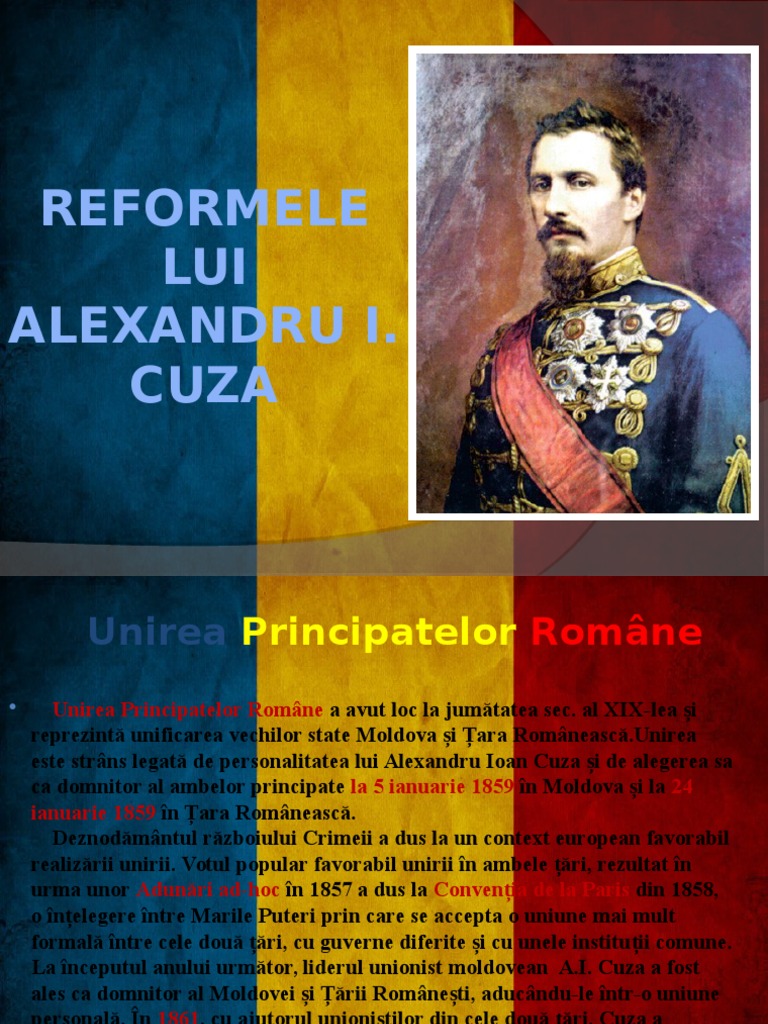 Unirea şi reformele lui alexandru ioan cuza contextul internaţional în care se realizează unirea celor două principate congresul de pace de la paris 1856 datorită înfrângerii rusiei. Nu putem încheia fără a sublinia că alexandru ioan cuza cel care în 1861 rostea. 20 march 1820 15 may 1873 was the first domnitor ruler of the romanian principalities through his double election as prince of moldavia on 5 january 1859 and prince of wallachia on 2 january 1859. Unirea principatelor române sau mica unire din 1859 a fost marcată şi de reformele lui alexandru ioan cuza iar de atunci în fiecare an la 24 ianuarie ne amintim cu emoție și mândrie de mărețul act prin care s au pus temeliile statului român modern.