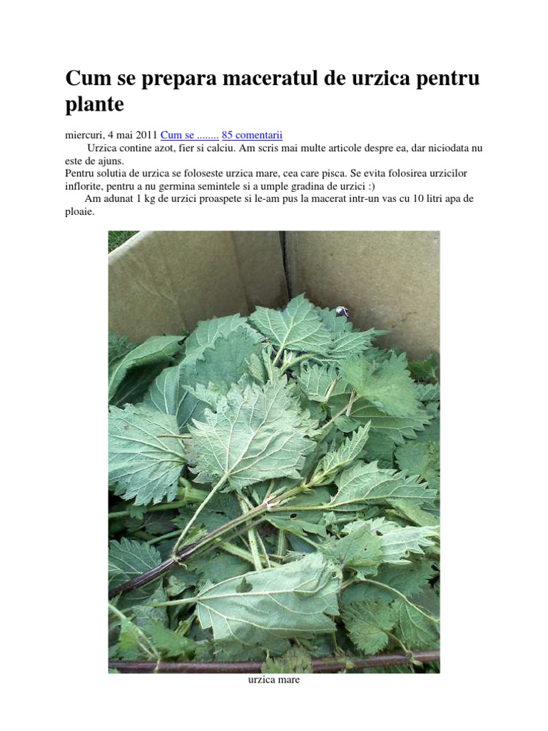 Aveți nevoie de 1 litru de lapte degresat zer sau kefir la 9 litri de apă 25 35 picături de tinctură de iod. Găleata sau butoiul cu urzicile puse la macerat se va depozita timp de o săptămână într un loc protejat de soare. Solutia a ieșit foarte foarte neagra. Eu am folosit apa de la fierberea bolboatelor de urzici.