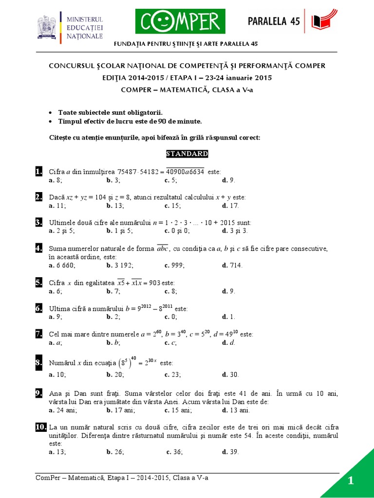 Comper 2020 subiecte și bareme etapa 1 matematică din 30 ianuarie 2020 toate clasele sursă concursurilecomper ro. Calendarul concursurilor nationale scolare fara finanatare men 2019 2020 pozitia 104. Subiectele de la concursul comper etapa i matematică ani școlari 2010 2015 2015 2016 fișiere atașate subiect si barem matematica etapai clasaii 10 11 pdf. Fiecare mentor trebuie sa introduca rezultatele elevilor de la clasa pregatitoare in termen de maxim 10 zile de la data desfasurarii concursului.