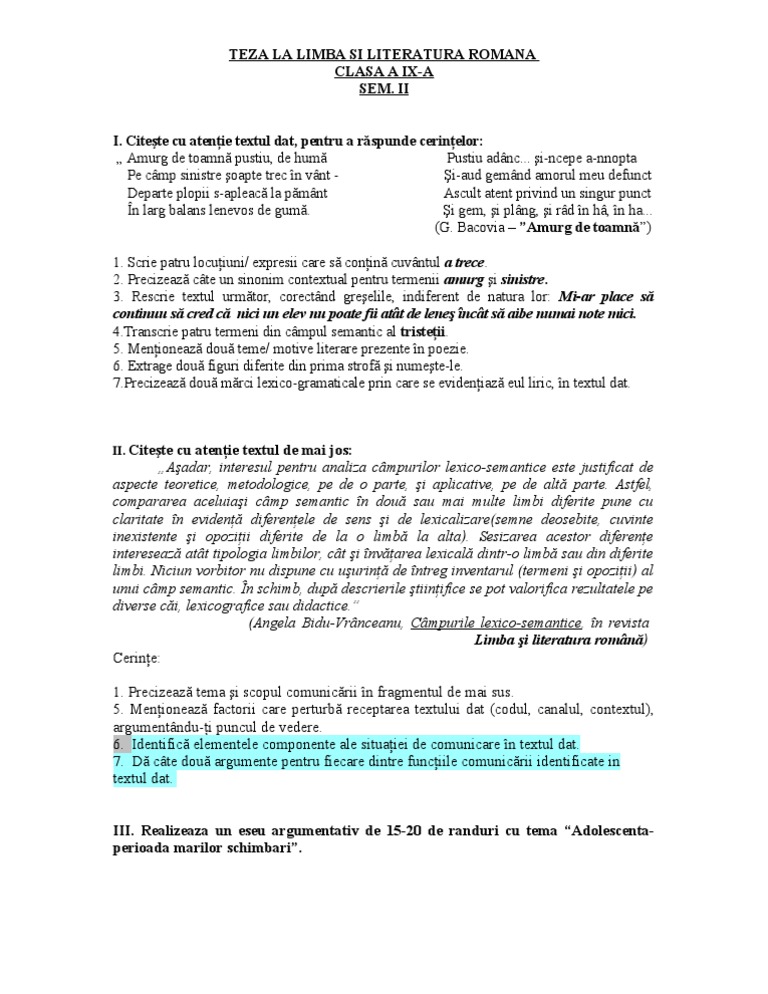 Subiecte teza limba romana clasa a 9 semestrul 1. 5 au spus mulţumesc. Vizualizaţi 0 review uri 1815 descărcări. Subiectul i 60 puncte a. Teza limba si lit.