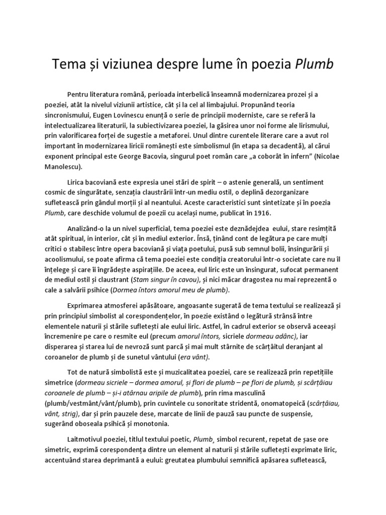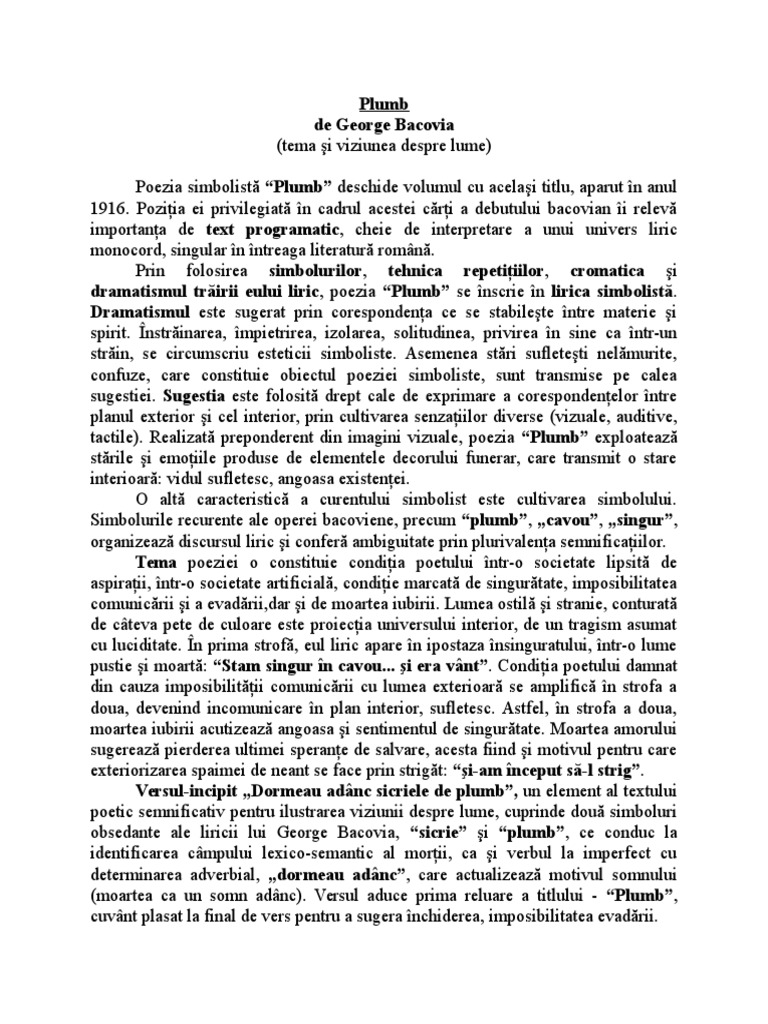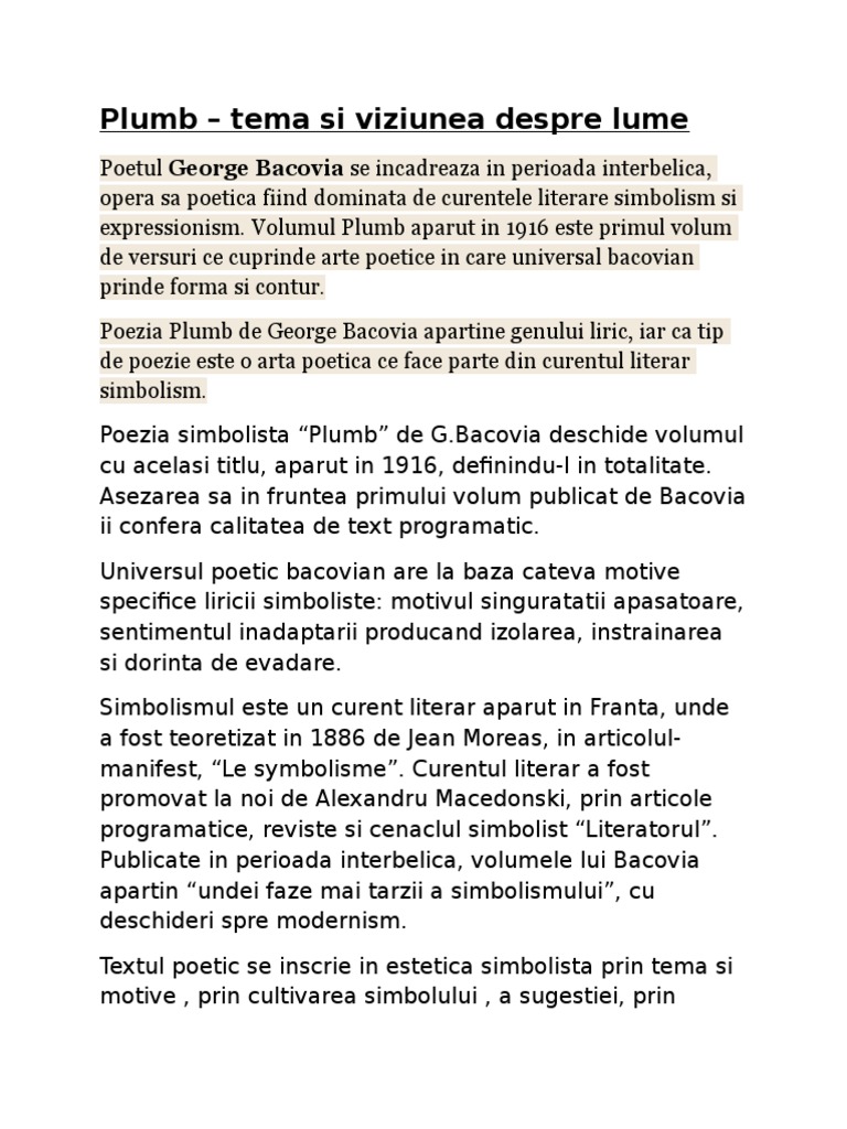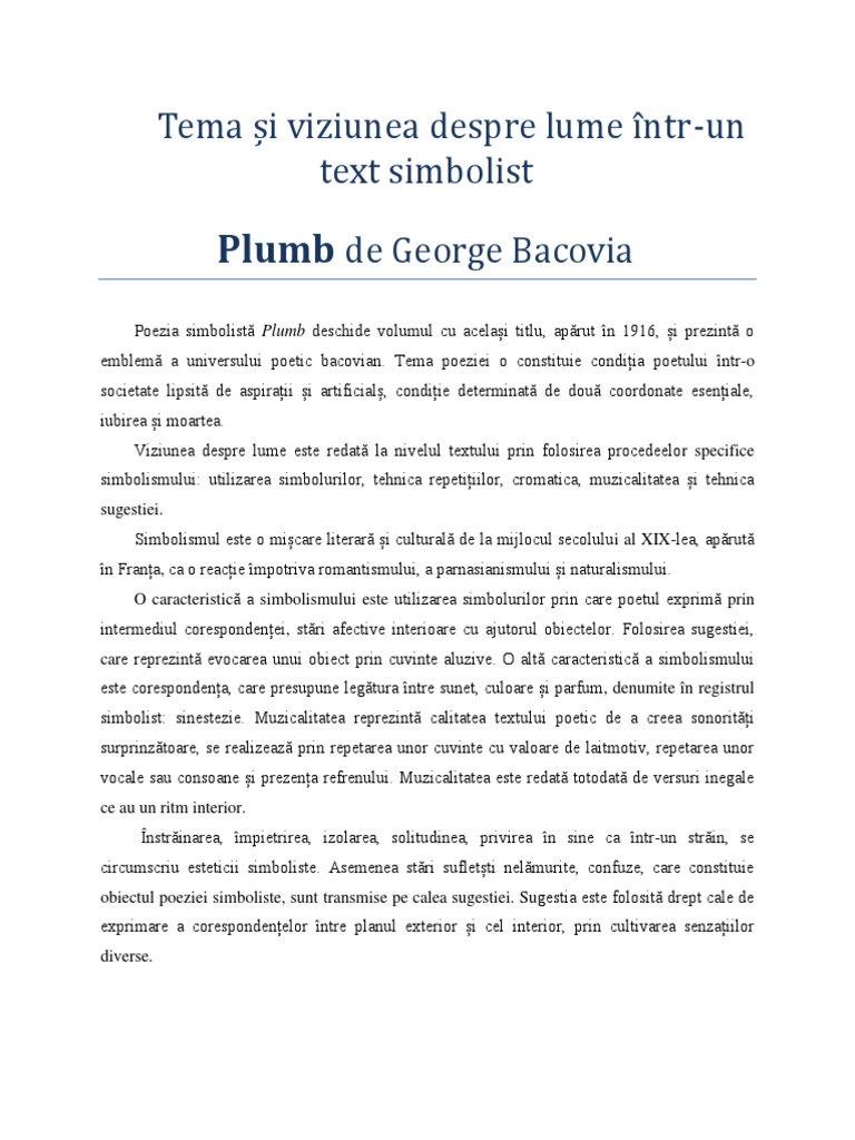 Tema operei plumb george bacovia o constituie viziunea eului poetic asupra universului. Lecții tema si viziunea despre lume plumb george bacovia reprezintă un punct împortant pe orbita simbolismului românesc. Text imbolit plumb de george bacovia poezia simbolist plumb deschide volumul cu acelai titlu aprut n 1916 i prezint o emblem a universului poetic bacovian. Tema și viziunea despre lume cerința de a scrie un text în care să prezinți tema și viziunea despre lume într un text aparținând lui george bacovia au primit o elevii de clasa a xii a de la profilul real la sesiunea august septembrie a bacalaureatului din 2014.