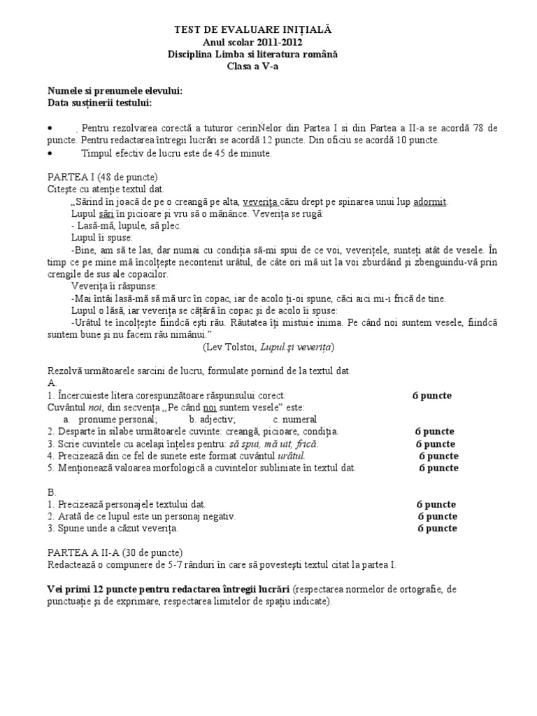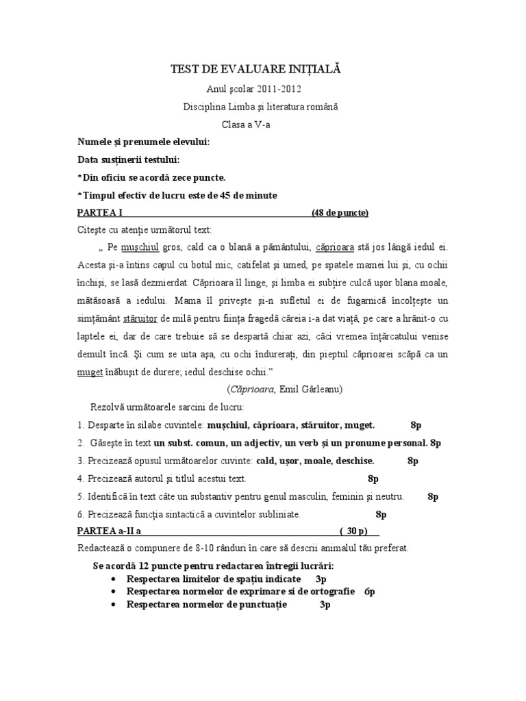 Materialele sunt concepute pentru prima saptamana de scoala pentru recapitulare si evaluare a elevilor care urmeaza sa sustina evaluarea nationala anul acesta. Test initial la limba romana clasa a v a. Transformă propoziţia dezvoltată în propoziţie simplă. Testare initiala clasa a v a romana.