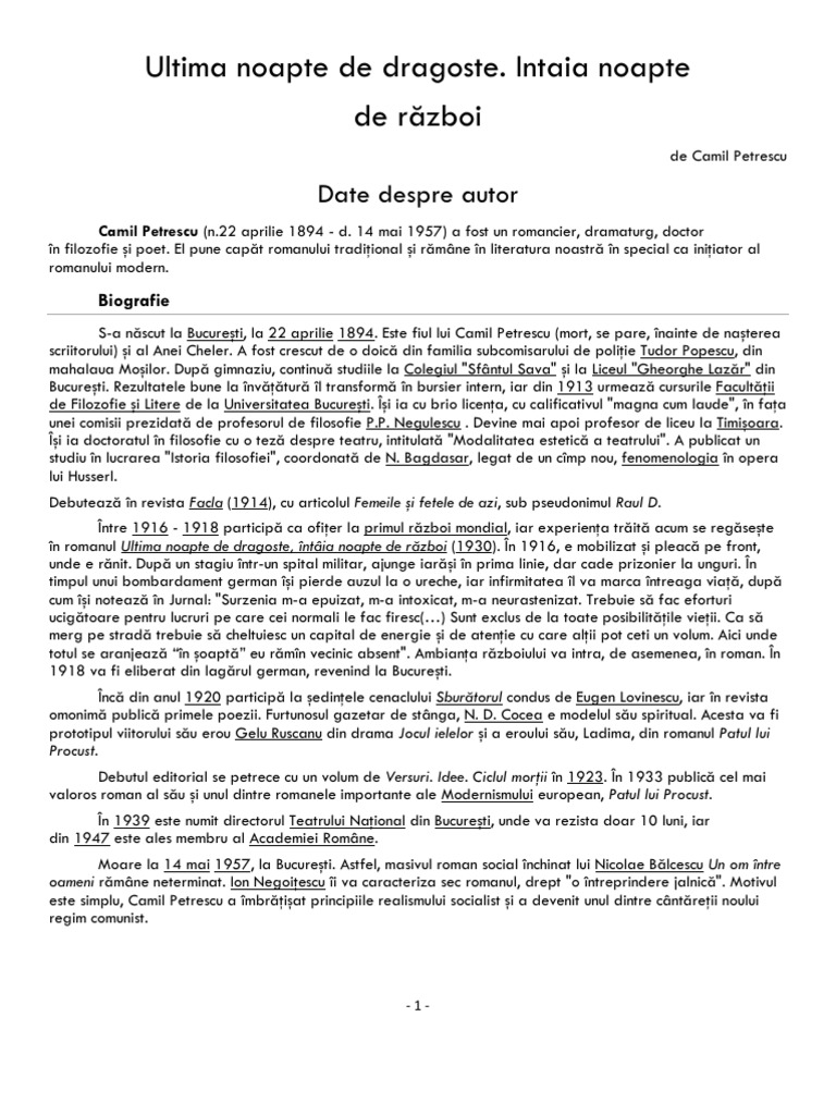 Cartea nti la piatra craiului in munte actiunea primului capitol se desfasoara in primvara anului 1916 in timpul actiunilor de fortificare tara pregtindu se pentru intrarea in primul rzboi mondial. în contextul literaturii interbelice camil petrescu a fost un scriitor controversat după apariţia romanelor ultima noapte de dragoste întâia noapte de război şi patul lui procust pentru că acestea au surprins prin noutatea creaţiei şi originalitatea formulei literare. In aceasta carte camil petrescu surprinde drama. Ultima noapte de dragoste intaia noapte de razboi romanul lui camil petrescu e compus din doua parti care nu au intre ele decat o legatura occidentala prima parte e un roman pasional in care ni se descrie istoria geloziei lui stefan ghiorghidiu in sufletul caruia evenimentele zilnice iau proportii exagerate si oarecum ridicole gelozia nu se poate masura decat prin.
