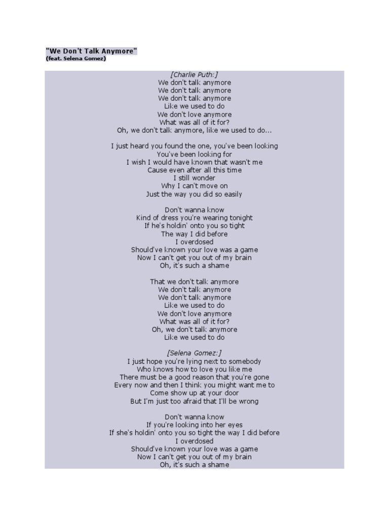 Versuri we don t talk anymore. Versuri we don t talk anymore romana de charlie puth feat selena gomez. De ce nu ne privim. Traducerea cântecului we don t talk anymore interpretat de charlie puth din engleză în română deutsch english español français hungarian italiano nederlands polski português brasil română svenska türkçe ελληνικά български русский српски العربية 日本語 한국어. Ooh we don t talk anymore like we used to do i just heard you found the one you been looking you been looking for i wish i would ve known that wasn t me cuz even after all this time i still want you why i can t move on.