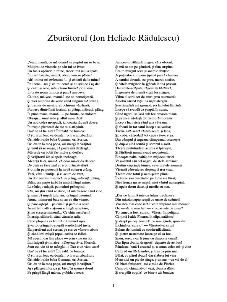 Zburatorul de ion heliade radulescu. Aceasta poezie aparuta pentru prima data in curierul romanesc nr. și pieptul mi se bate. Nu este vorba de o simpla transpunere directa a unor credinte. Balada se distinge printr o exceptional de bine inspirata preluare a mitului folcloric al zburatorului.