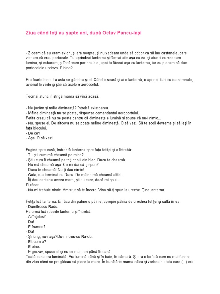 Ziua când au toți șapte ani de octav pancu iaşi povesti pentru copii octav pancu iaşi povesti pentru copii ziua când toţi au şapte ani ziceam că eu eram un avion şi era noapte şi nu vedeam unde să cobor ca să iau castanele care ziceam că erau portocale. Numai cei care au şapte ani merg la şcoală. 0 stele 0 review uri. 25 septembrie 2018 18 20.